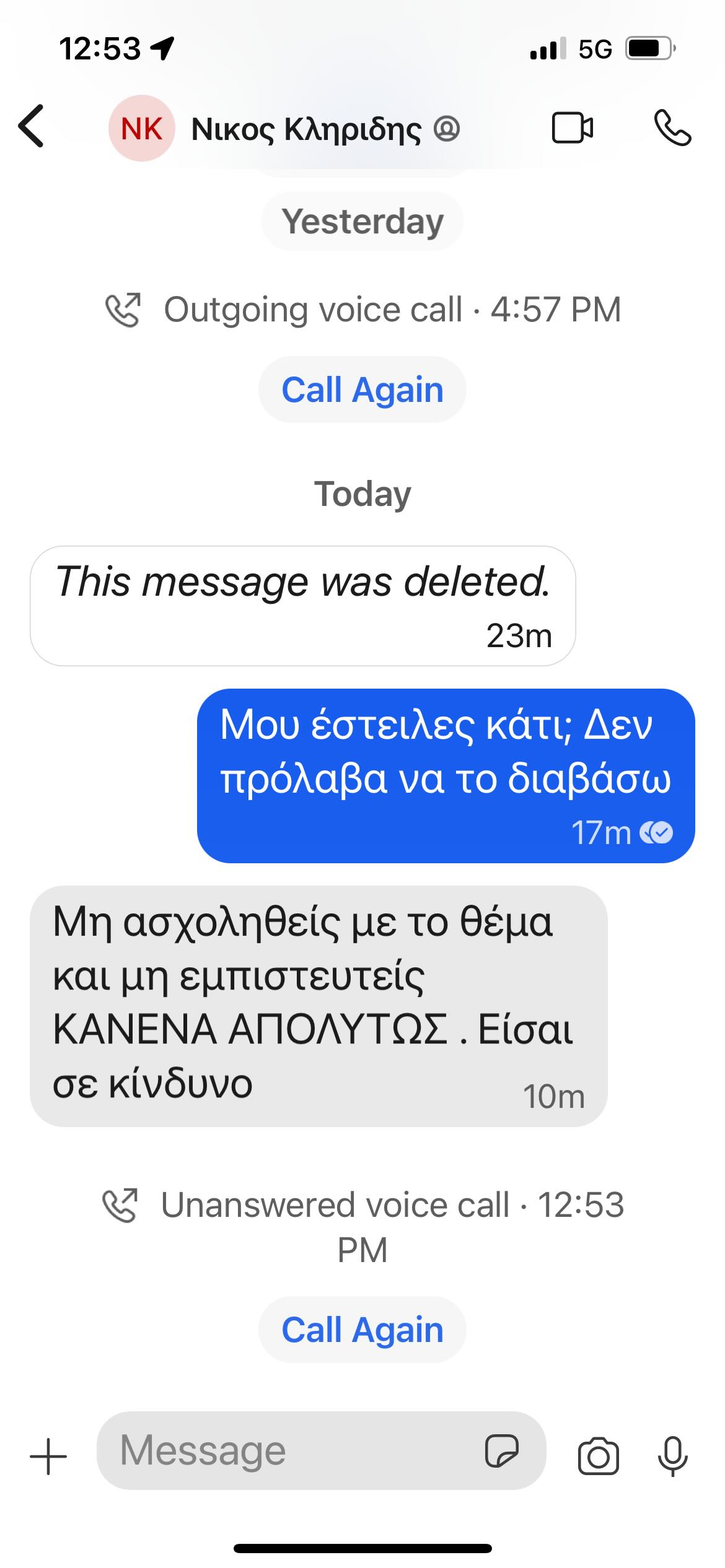 Λίγες μέρες αργότερα και συγκεκριμένα στις 8 Μαΐου 2023, ενώ είχα άρχισα να ερευνώ τους ισχυρισμούς της, πήρα μήνυμα (Signal) από τον Νίκο Κληρίδη με το εξής περιεχόμενο: «Μην ασχοληθείς με το θέμα και μην εμπιστευτείς ΚΑΝΕΝΑ ΑΠΟΛΥΤΩΣ. Είσαι σε κίνδυνο».[3] Το μήνυμα αυτό το εξέλαβα ως σοβαρή απειλή για την ζωή μου.