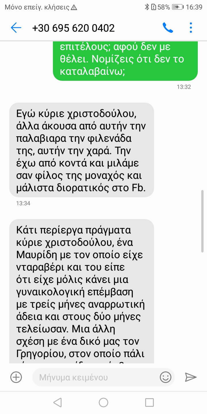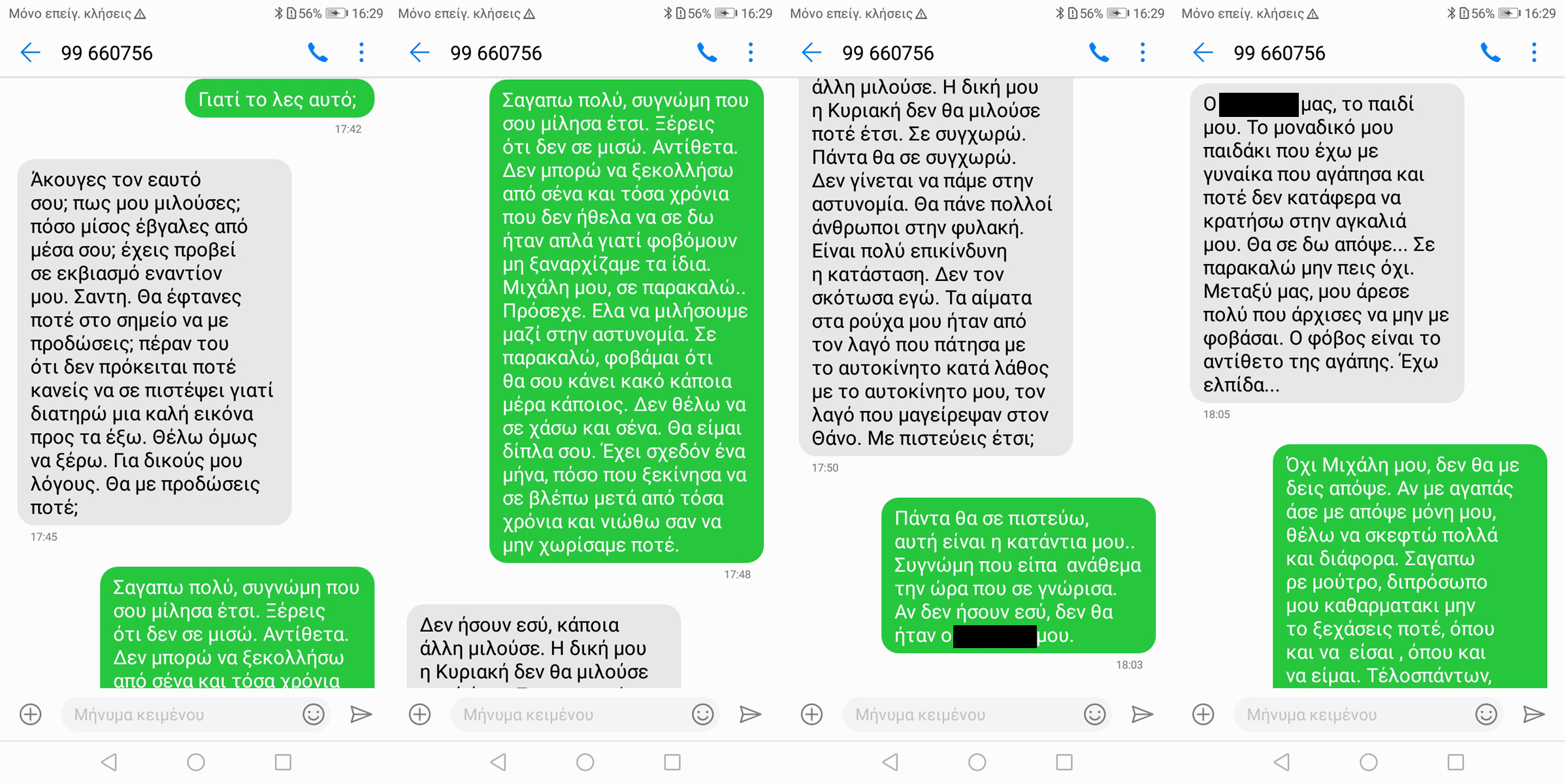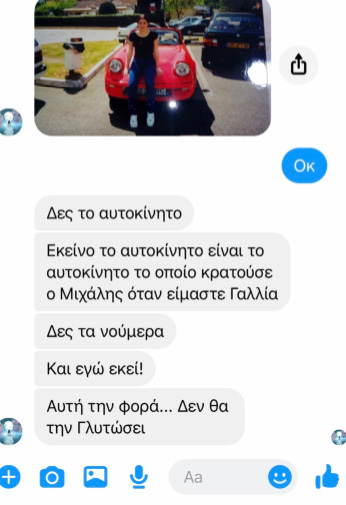 ΜΧ: «Αγάπη μου να είσαι έτοιμη εντός της ημέρας ή αύριο να σε πάρω τηλέφωνο να συνεννοηθούμε για να μου δώσεις το τηλέφωνο σου. Σου πήρα άλλο με κάρτα χρόνου. Μίλησα με δικό μου στο ηλεκτρονικό έγκλημα να σου το ελέγξει αν είναι καθαρό και να σου βάλει πρόγραμμα για να μη σου το χακάρει κανένας. Μίλησα με Γαλλία. Είναι όλα οκ! Μας περιμένουν.»