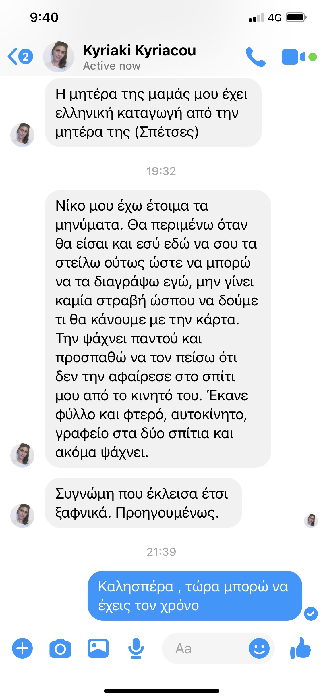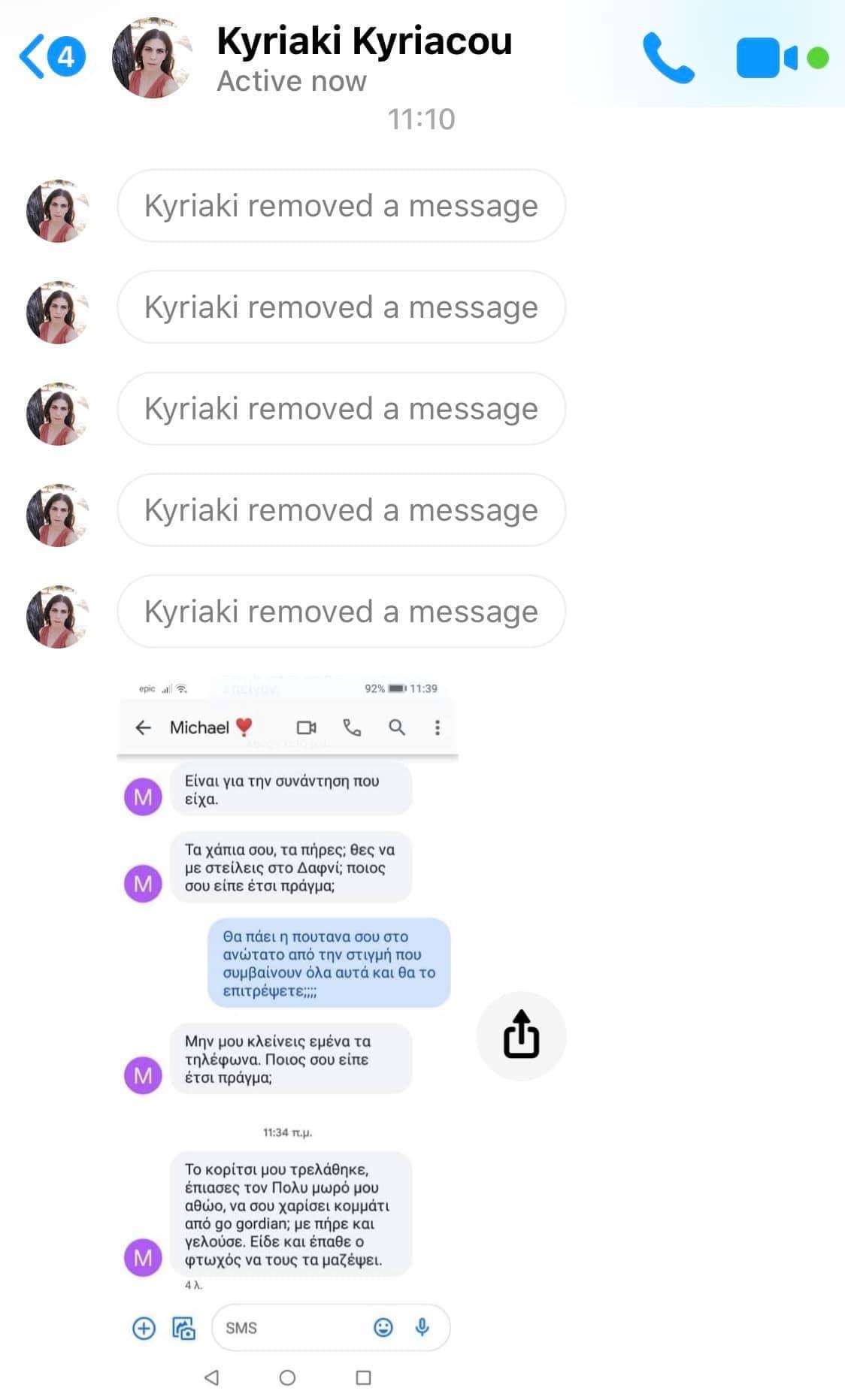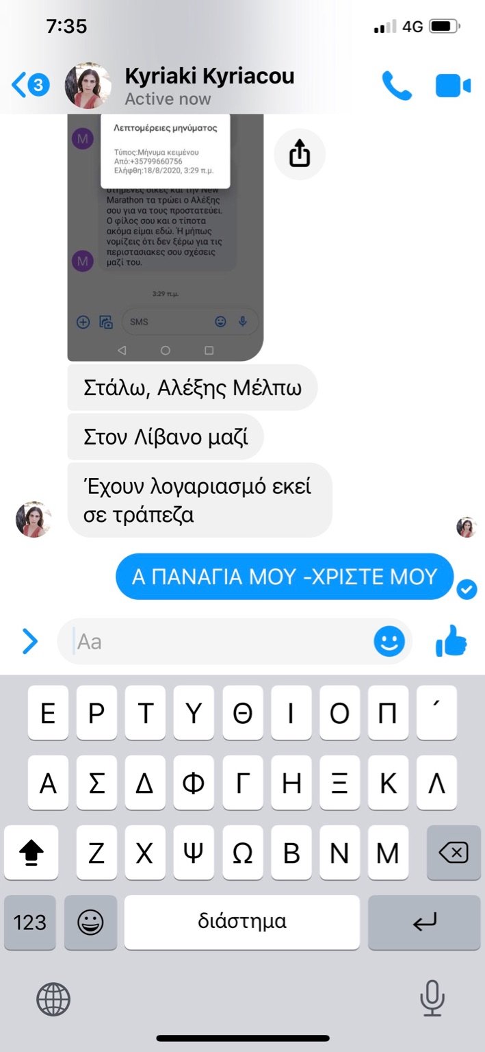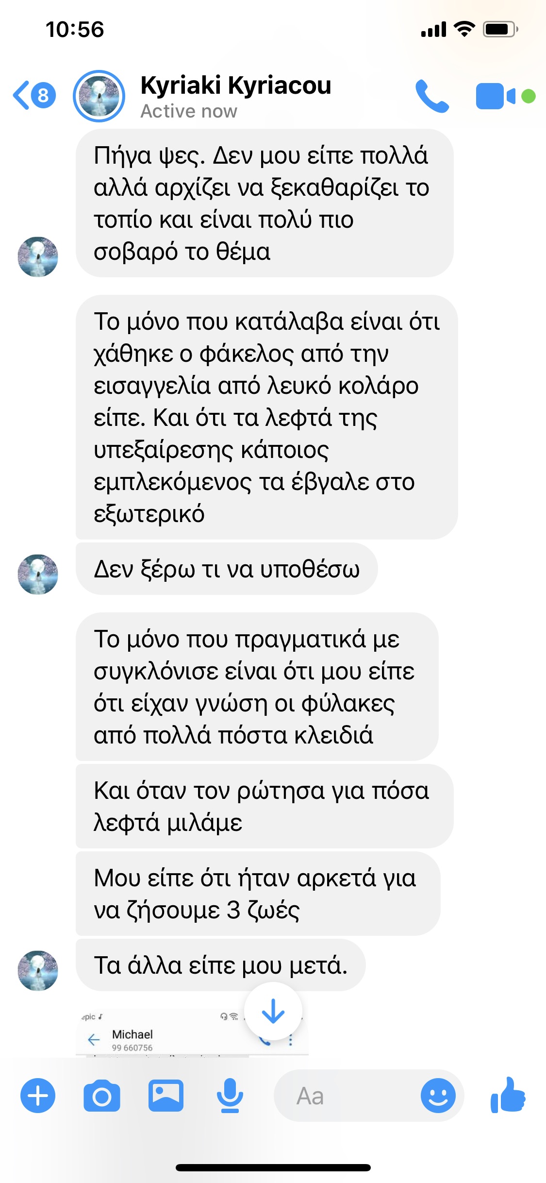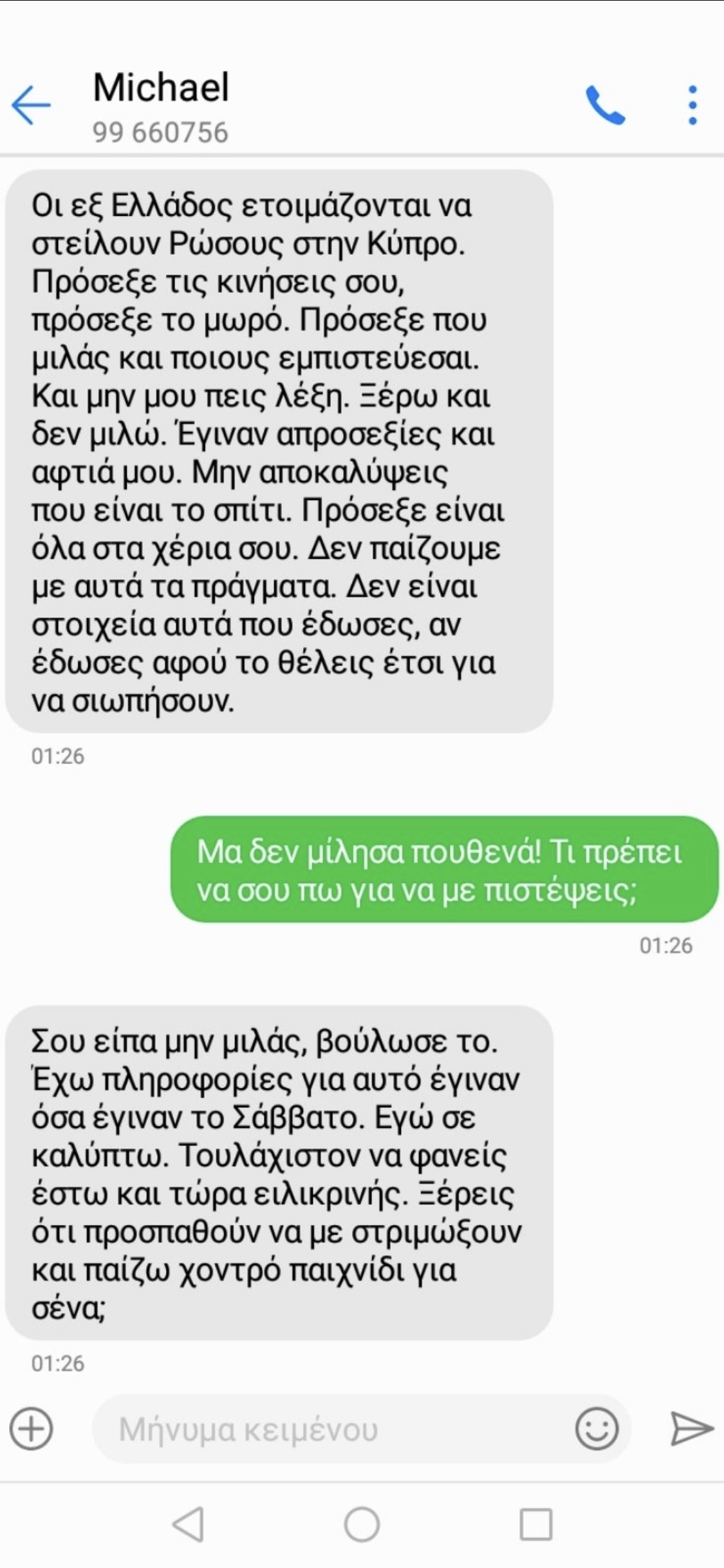 «Στην Κύπρο έμαθαν ότι έφυγα και γίνεται ένας πόλεμος κρυφός. Μου το έστειλε ο Μιχάλης με μήνυμα ότι εννά τον φαν. Έμαθαν ότι έφυγα, ξέρουν ότι τα λεφτά εν πάνω μου και πιέζουν τον να τους πουν που είμαι». (Ηχογραφημένη συνομιλία, 16.3.2021)