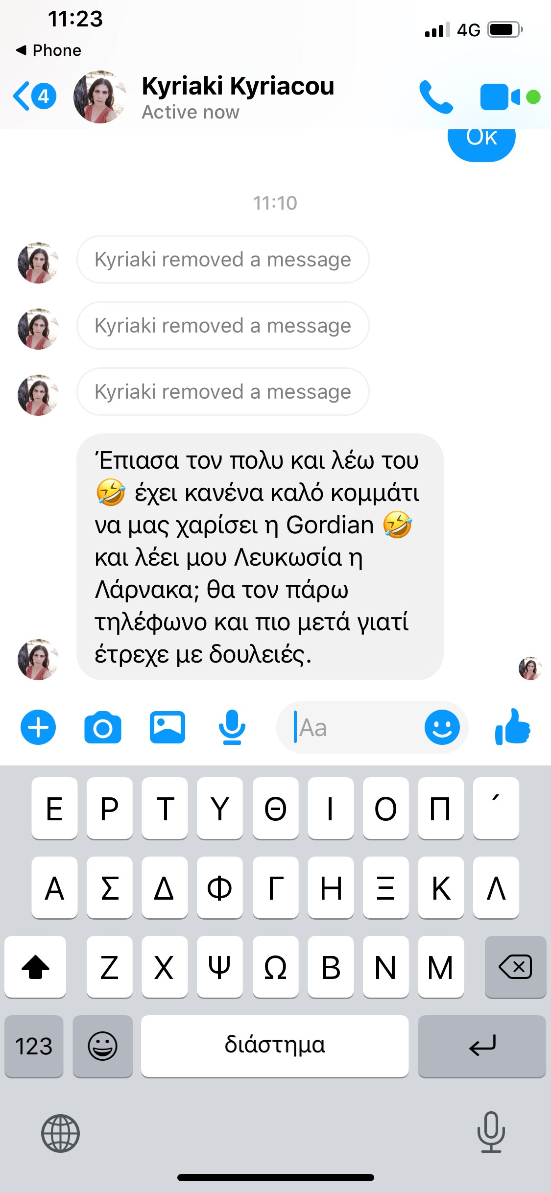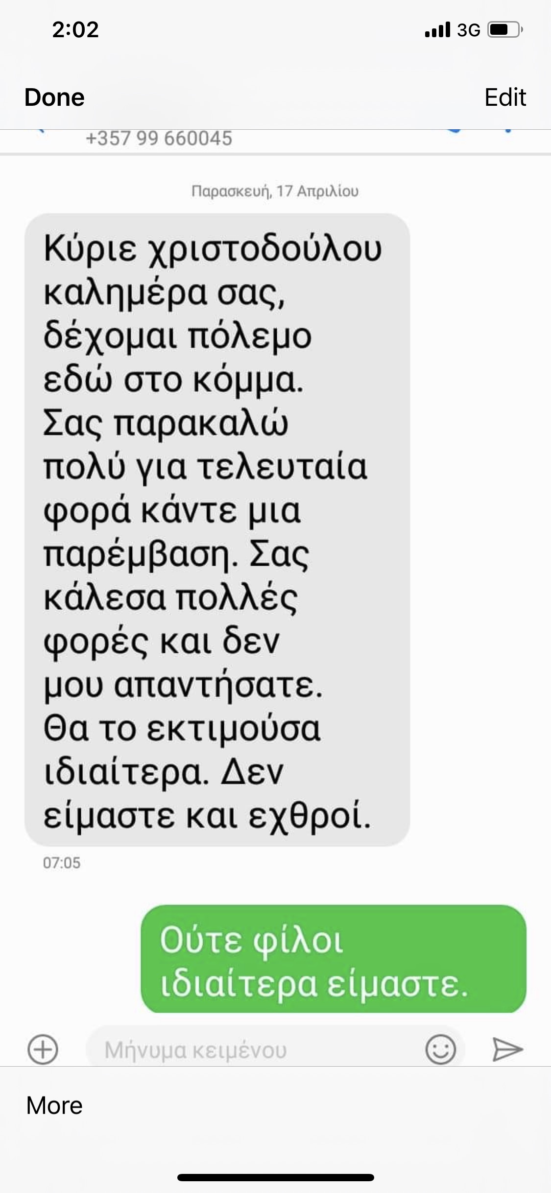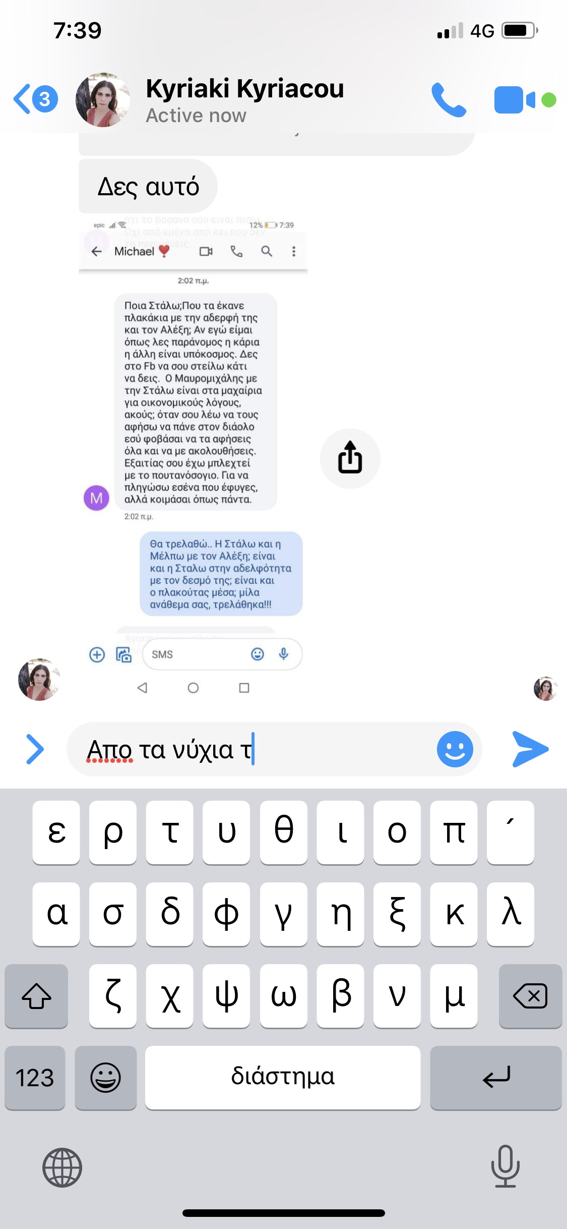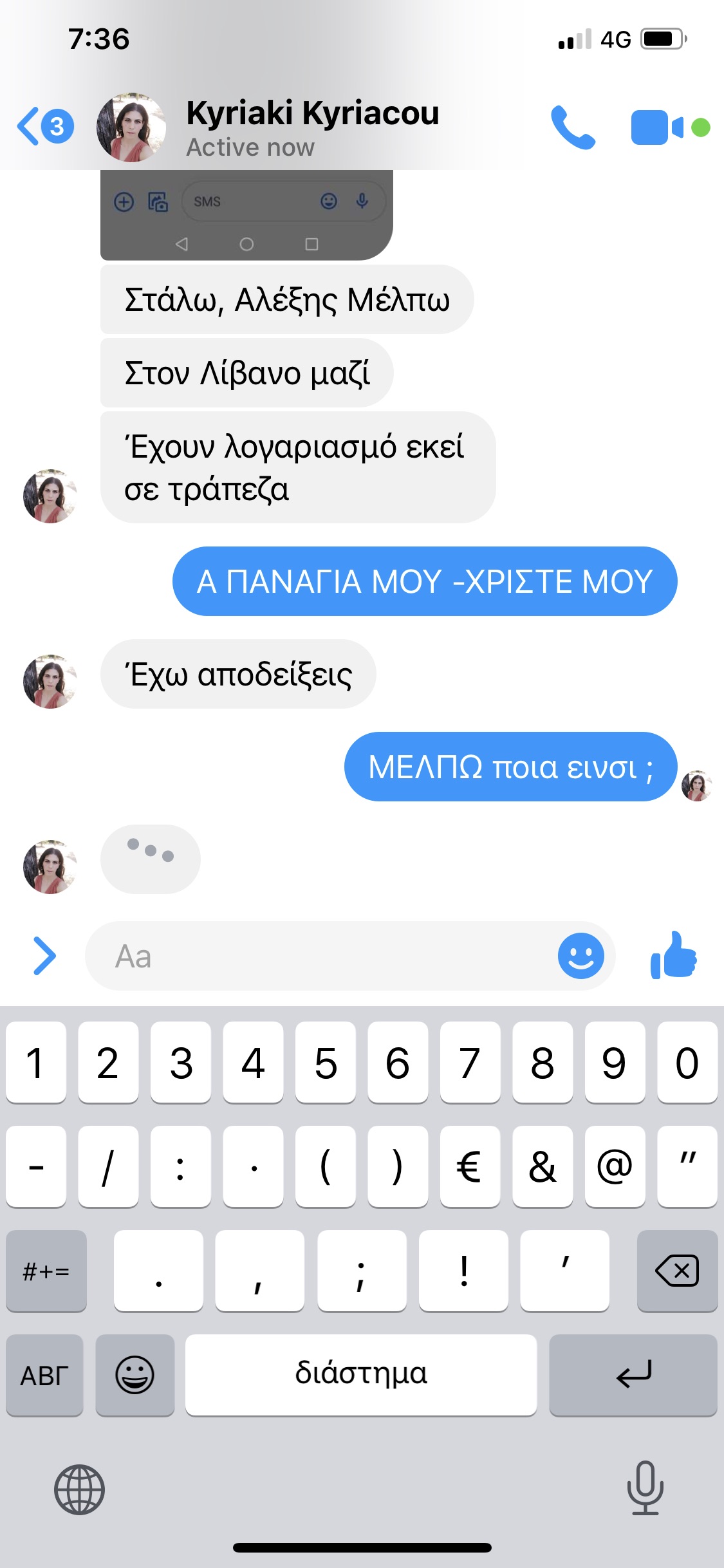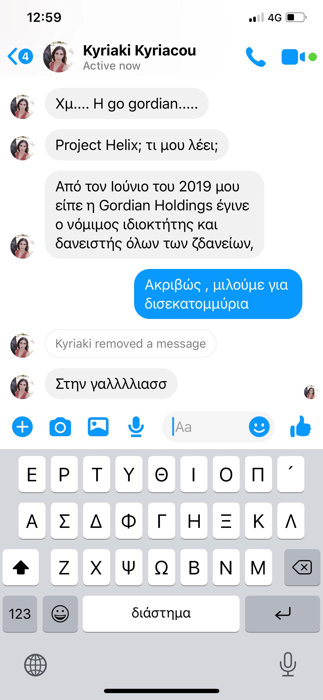 «Στην Κύπρο έμαθαν ότι έφυγα και γίνεται ένας πόλεμος κρυφός. Μου το έστειλε ο Μιχάλης με μήνυμα ότι εννά τον φαν. Έμαθαν ότι έφυγα, ξέρουν ότι τα λεφτά εν πάνω μου και πιέζουν τον να τους πουν που είμαι». (Ηχογραφημένη συνομιλία, 16.3.2021)