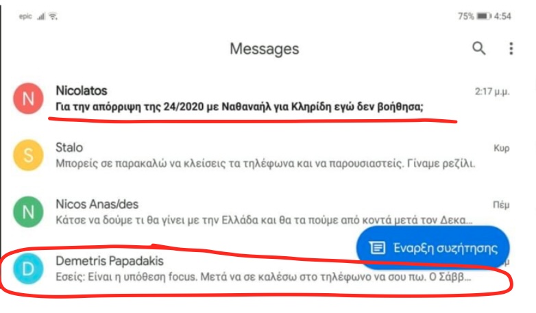 Στο ίδιο Screenshot φαίνεται η πρώτη γραμμή της απάντησης του Χριστουδούλου σε μήνυμα που πήρε από τον Παπαδάκη: