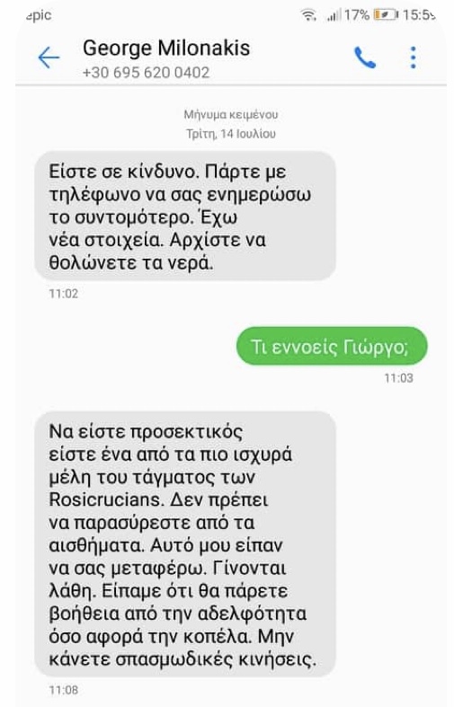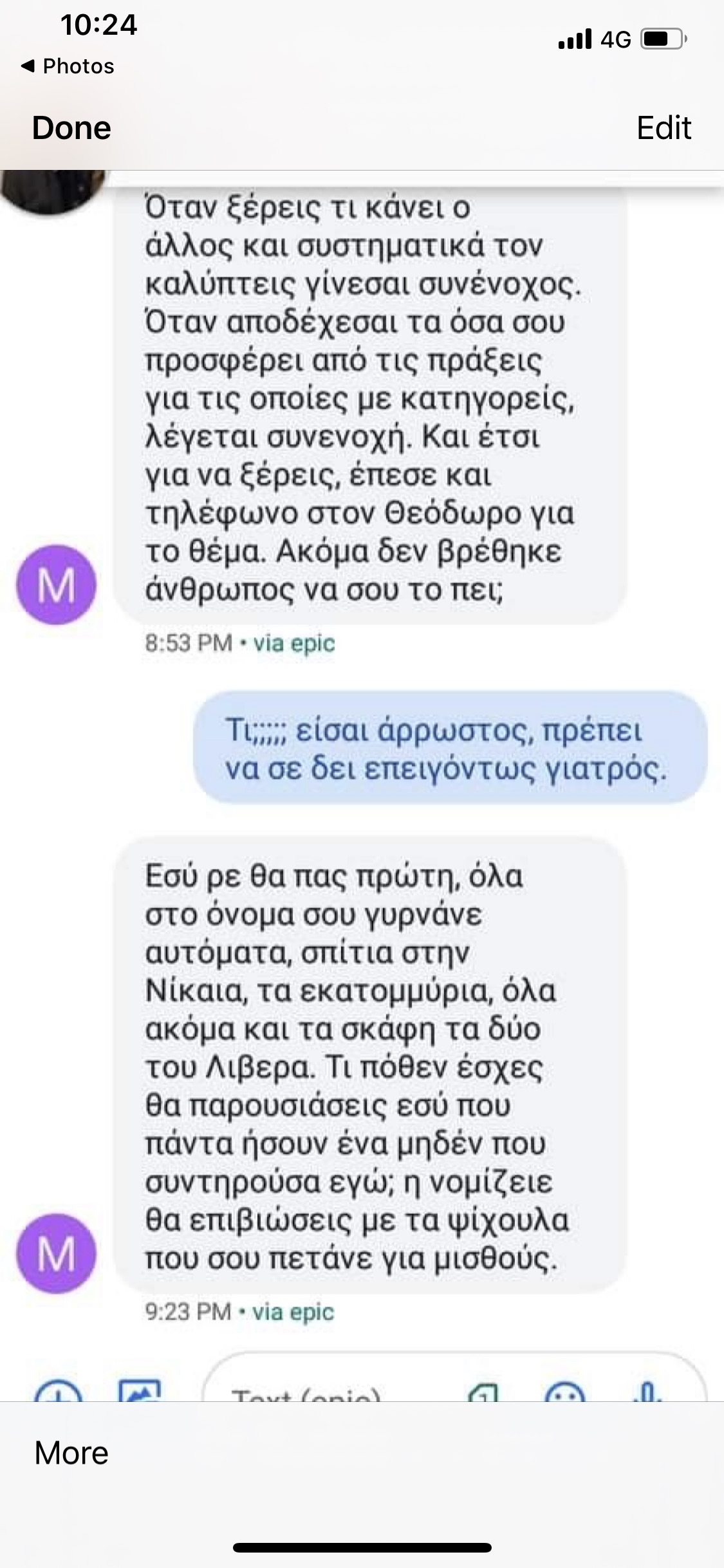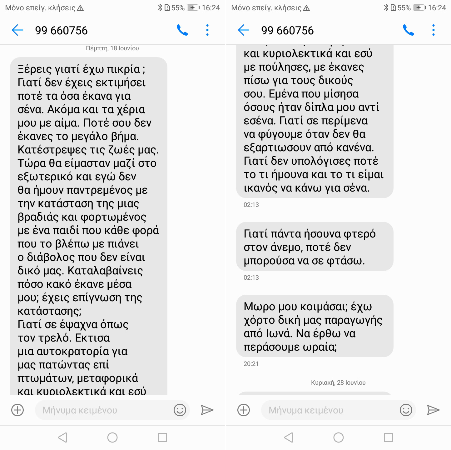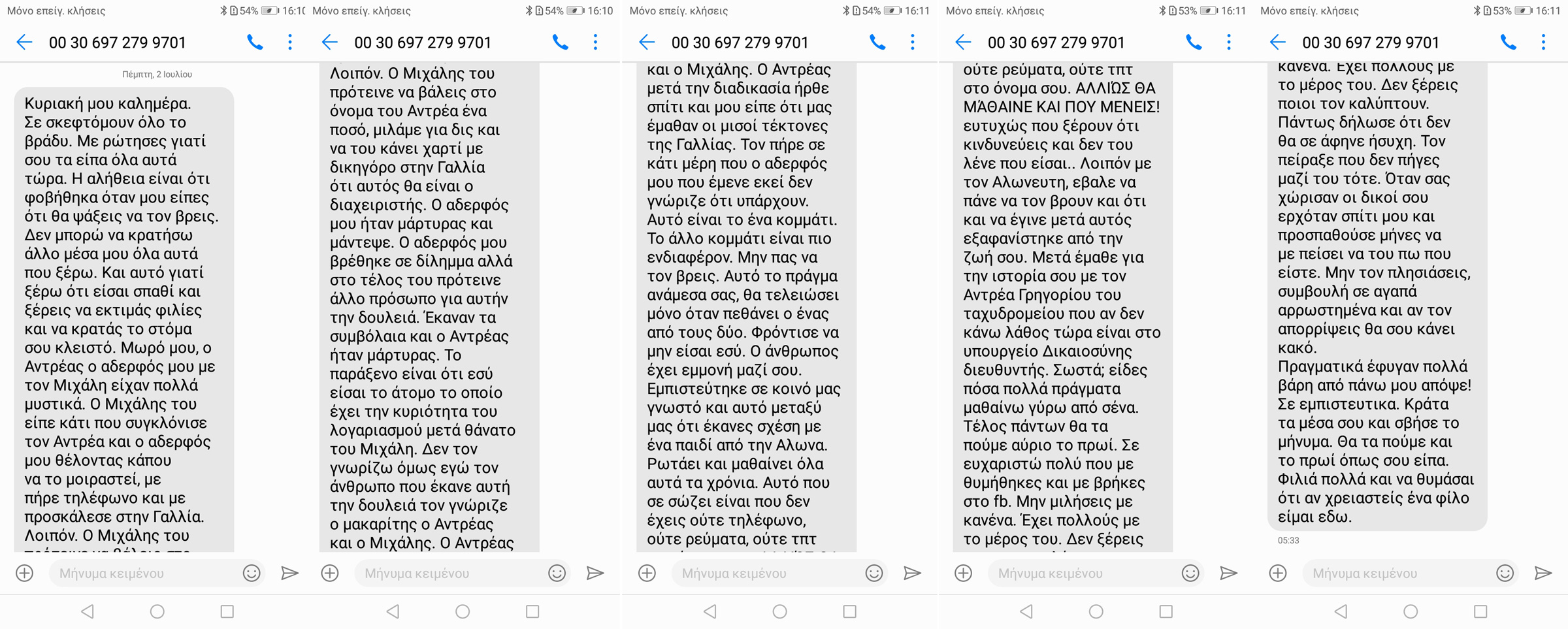 «Ξέρεις μίλησα με κάποιο άτομο και μου είπε κάποια πράγματα. Μου είπε ότι κινδυνεύω από εσένα. Δεν με ενδιαφέρει. Είμαι έτοιμος για όλα. Για κάθε πόλεμο, ακόμα και για το θάνατο. Μου είπαν ότι θα μπεις μπροστά και θα κινδυνέψω. Όμως θα έρθω, το να είμαι εδώ δεν ωφελεί. Μου είπαν ότι δεν θα είσαι μόνη σου και εγώ ξέρω πολύ περισσότερα και δεν θα είναι ο [REDACTED]. Έχω την κατάρα να αντιλαμβάνομαι τα πάντα. Εσύ κοιμάσαι. Ο λόγος που σου τα άφησα όλα είναι γιατί ξέρω μέσα μου πως ο κίνδυνος στον οποίο αναφέρεται είναι το τέλος μου και θέλω να είστε εξασφαλισμένοι. Το αύριο σας σκέφτομαι». (Είναι στο προηγούμενο αρχείο η πηγή)