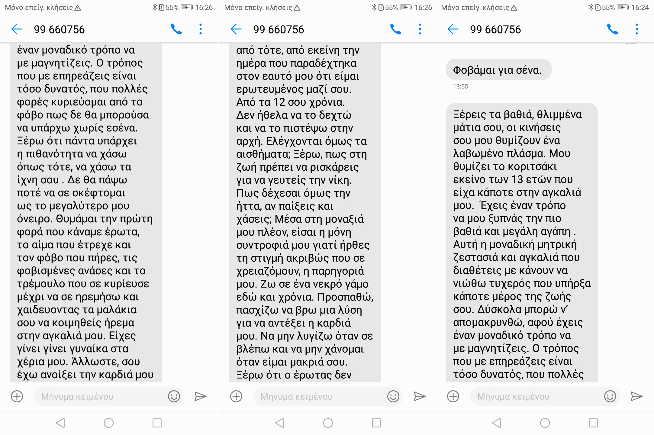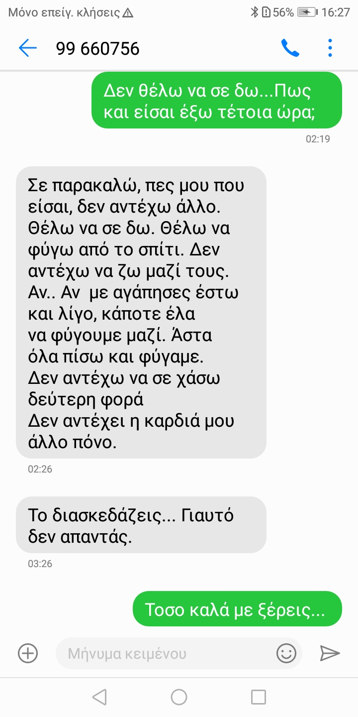 ΜΧ: Σε παρακαλώ πες μου που είσαι, δεν αντέχω άλλο. Θέλω να σε δω. Θέλω να φύγω από το σπίτι. Δεν αντέχω να ζω μαζί τους. Αν με αγάπησες έστω και λίγο κάποτε έλα να φύγουμε μαζί. Άστα όλα πίσω και φύγαμε. Δεν αντέχω να σε χάσω δεύτερη φορά. Δεν αντέχει η καρδιά μου τέτοιο πόνο.[23]