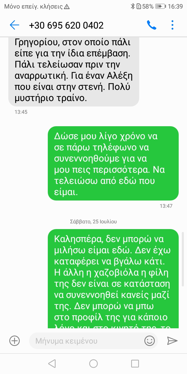 ΜΧ: Απάντησε το τηλέφωνο σου, έρχομαι. Σε παρακαλώ πες μου που είσαι. Δεν αντέχω άλλο.