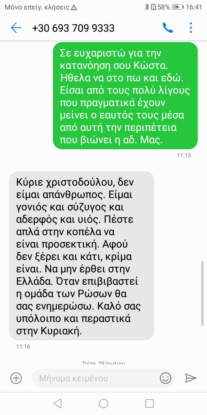 «Κυριακή μου, καλημέρα έχεις δίκαιο δεν είναι εύκολο να ξεχαστεί όλο αυτό, γι αυτό σε παρακαλώ φρόντισε να τα πούμε ξανά από κοντά οι δυό μας αυτή τη φορά...