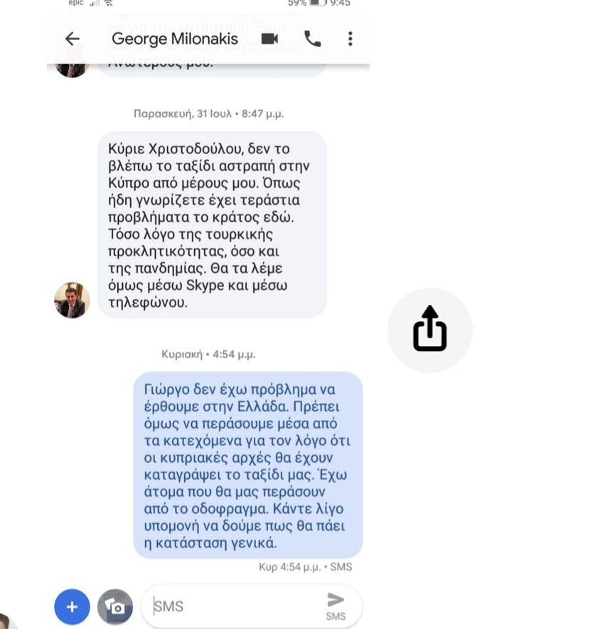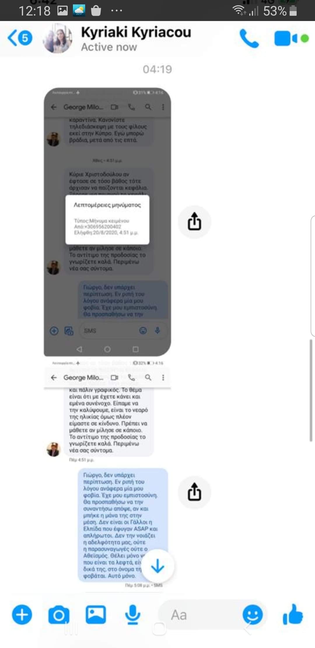 Στις 19 Αυγούστου 2020, στις 2:17 έφτασε στο κινητό του Μιχάλη Χριστοδούλου ένα μήνυμα από τον Μύρωνα Νικολάτο, που αναφέρει τα εξής:
