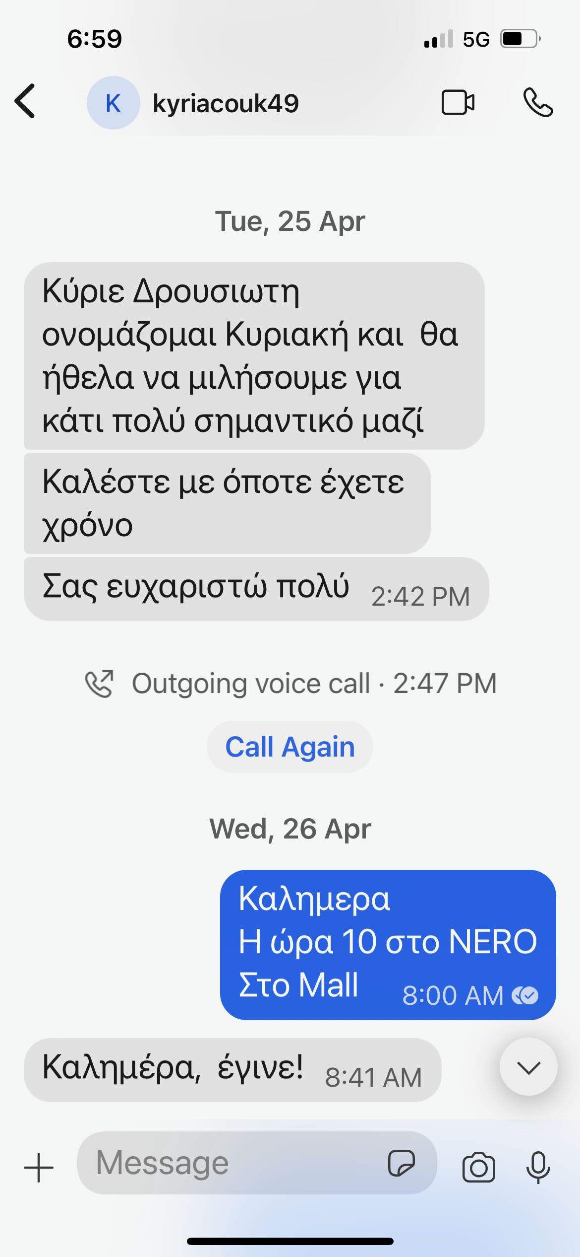 Στις 25 Απριλίου 2023, πήρα μήνυμα από τη [REDACTED] (στο δημοσιευμένο μου άρθρο διατήρησα το ψευδώνυμο Σάντη που της είχε δώσει ο Μιχάλης Χριστοδούλου) η οποία ήθελε να με συναντήσει «για να μιλήσουμε για κάτι πολύ σημαντικό μαζί.»[2] Συναντηθήκαμε την επομένη στην καφετέρια Nero στο Mall of Cyprus.