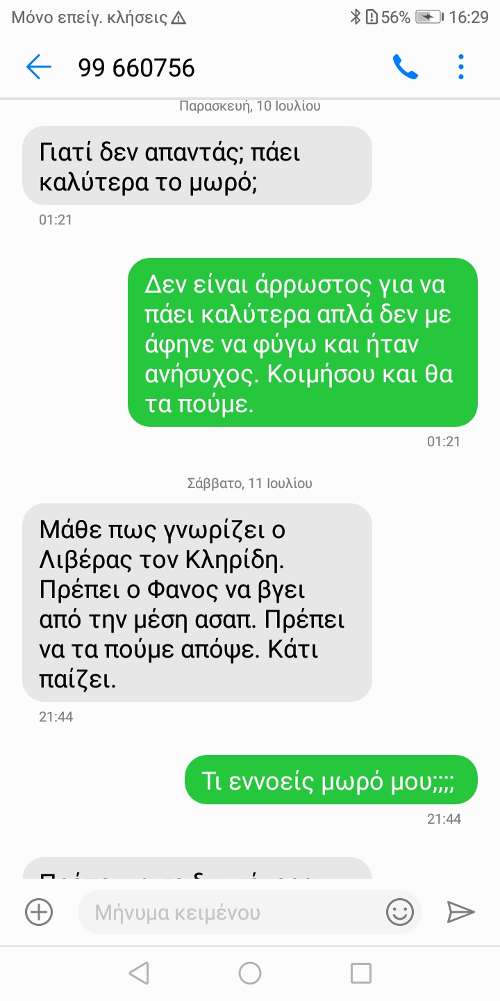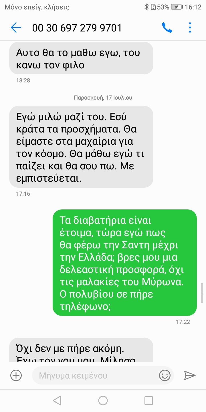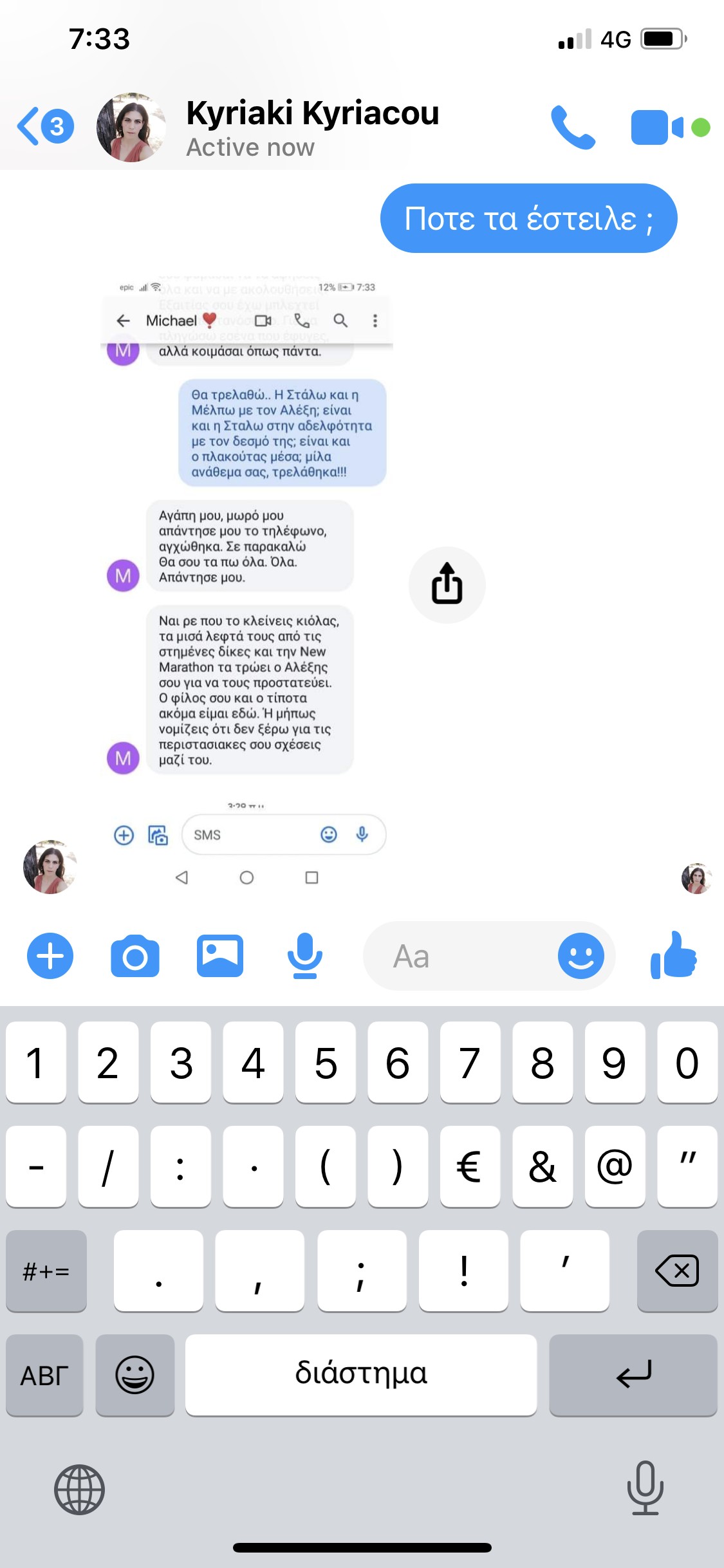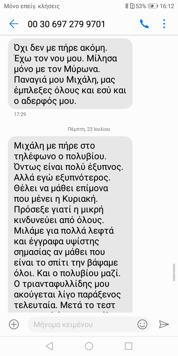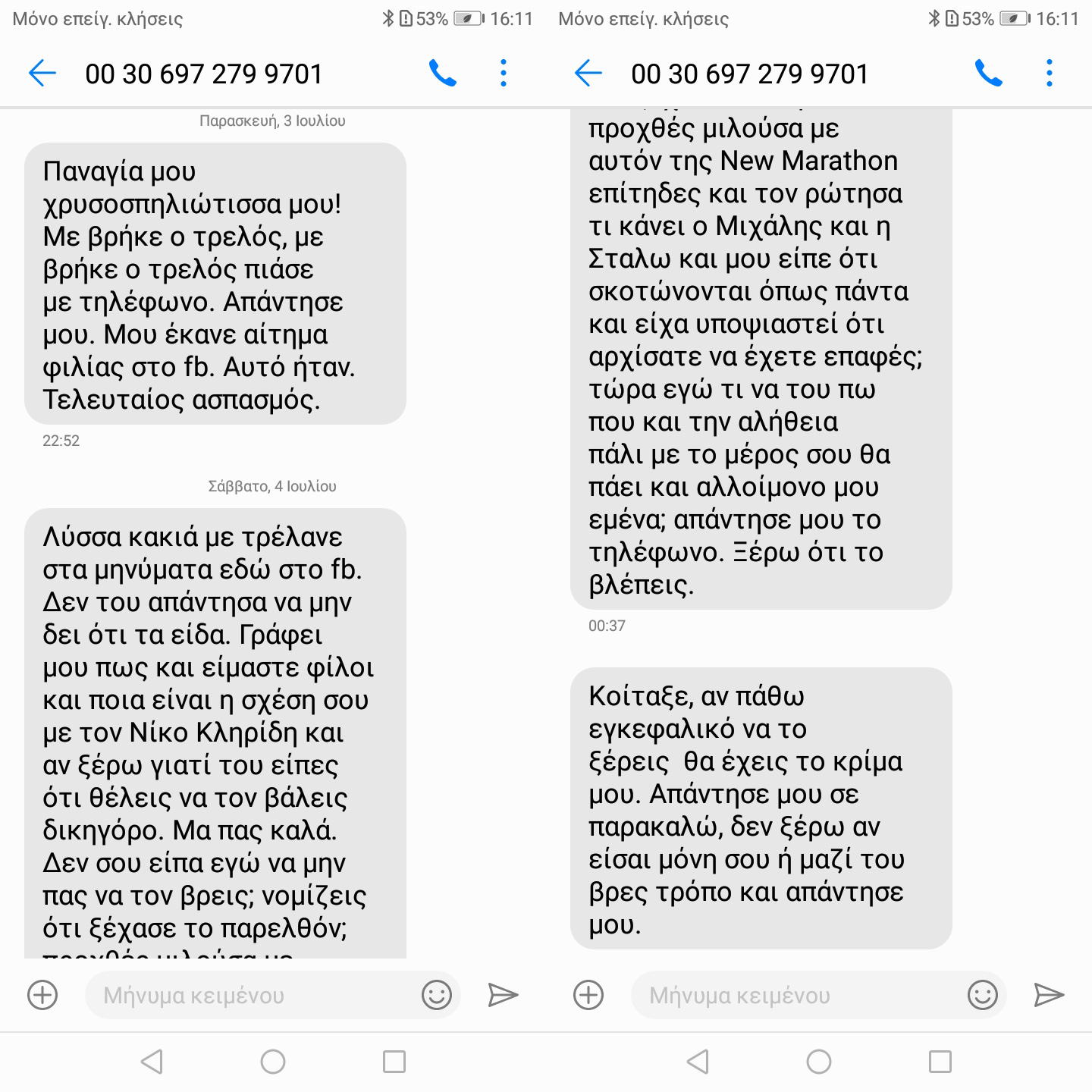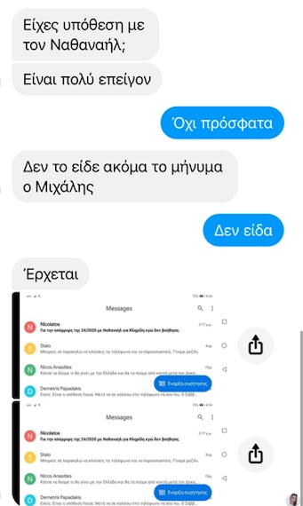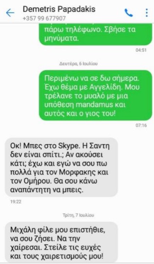 «Νίκο μου έχω έτοιμα τα μηνύματα. Θα περιμένω όταν θα είσαι εδώ να σου τα στείλω, ούτως ώστε να μπορώ να τα διαγράψω εγώ, μην γίνει καμία στραβή ώσπου να δούμε τι να κάνουμε με την κάρτα».