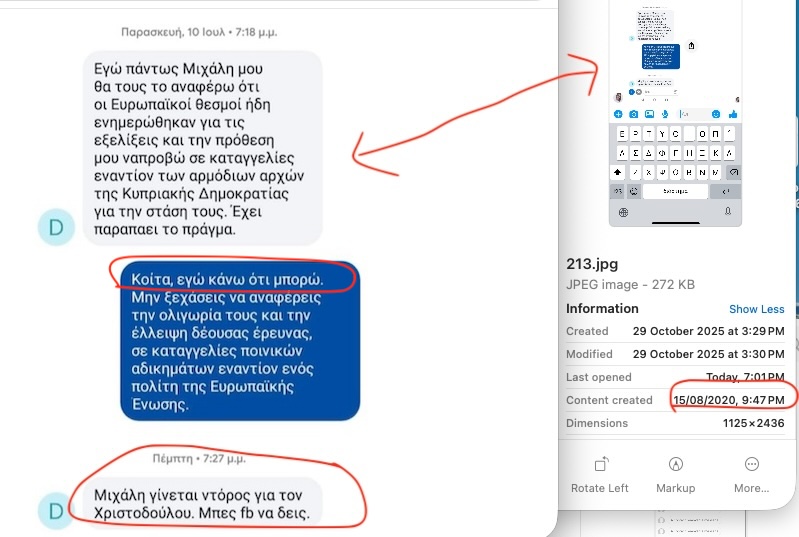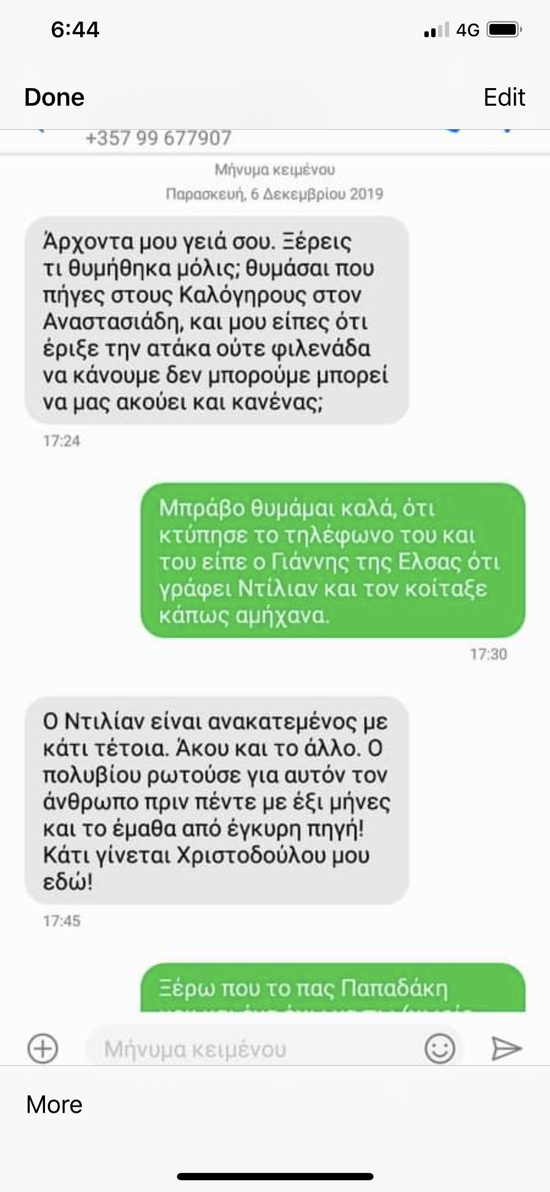 Το μήνυμα του Παπαδάκη προς τον Χριστοδούλου, φαίνεται σε άλλο φωτογραφικό στιγμιότυπο, μαζί με συνομιλία τους η οποία προηγήθηκε, ημερομηνίας 15 Αυγούστου 2020, κατά την οποία συζητούν την καταγγελία που έκανε ο Παπαδάκης στην Αστυνομία για τις διαφωνίες του με την ΕΔΕΚ.[10]