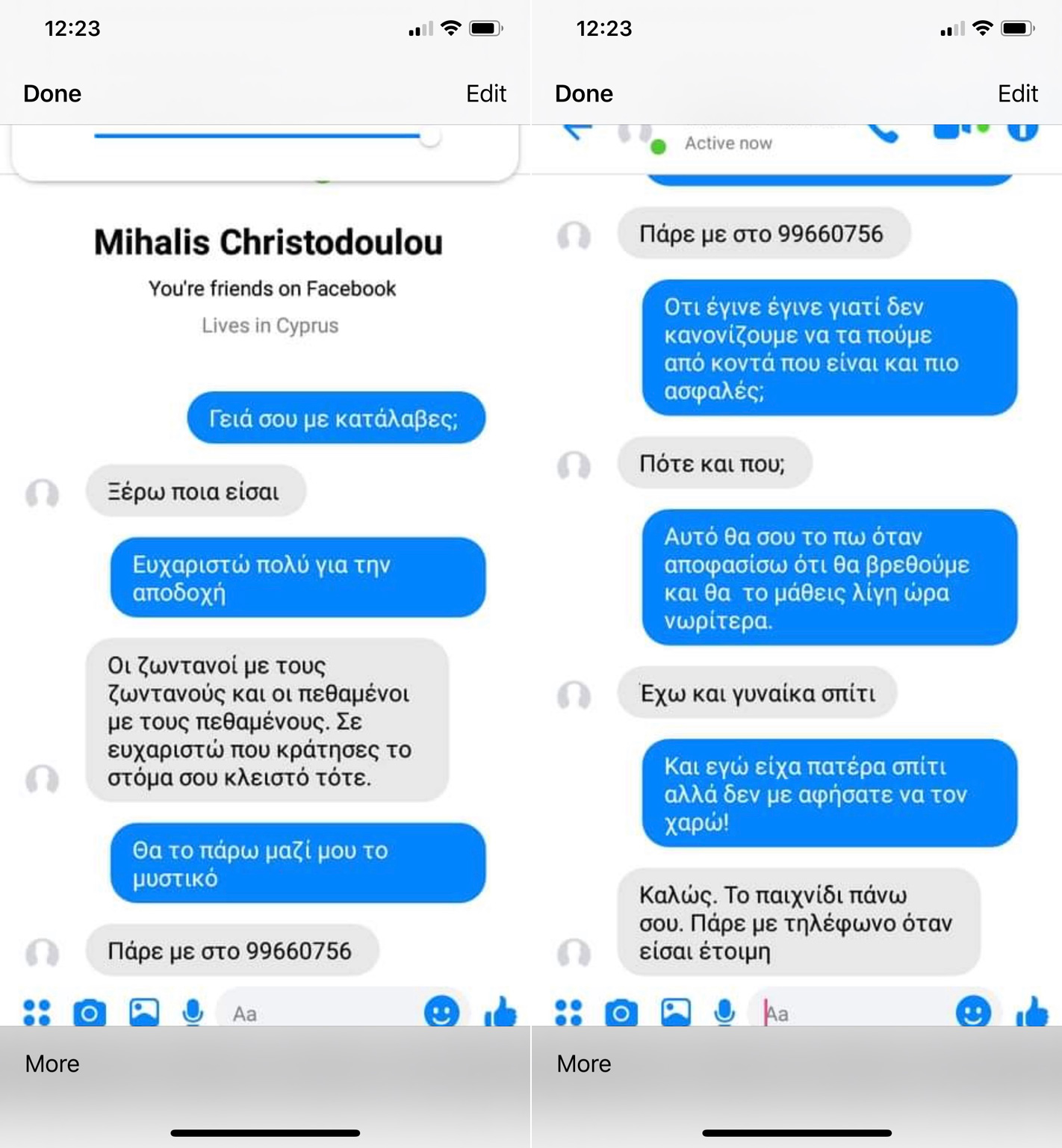 Πριν αρχίσω να συνδέω τον Μιχάλη Χριστοδούλου με τα μηνύματα, επιβεβαίωσα ότι πρόκειται για υπαρκτό πρόσωπο, ο οποίος επικοινωνούσε μαζί της με το τηλέφωνο του και με τη φωτογραφία του.