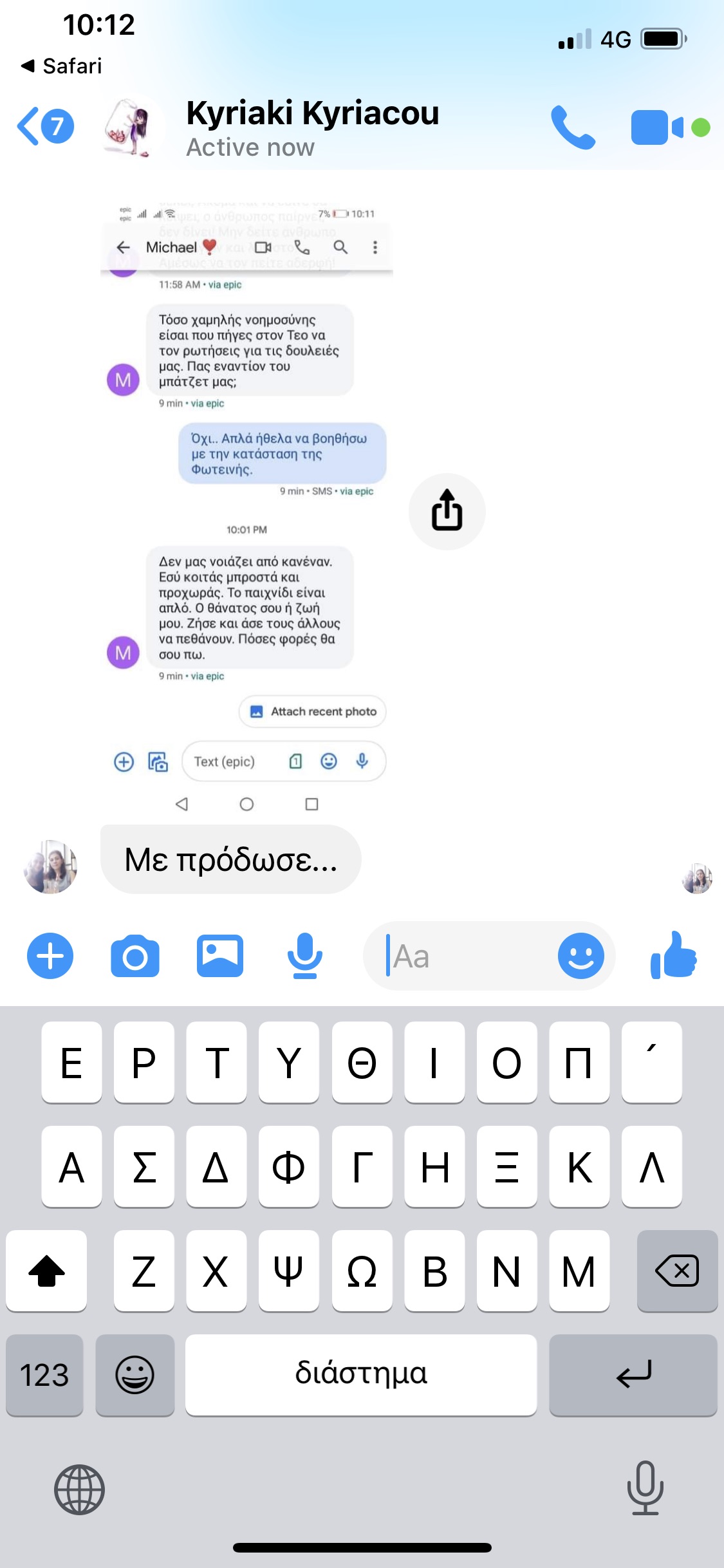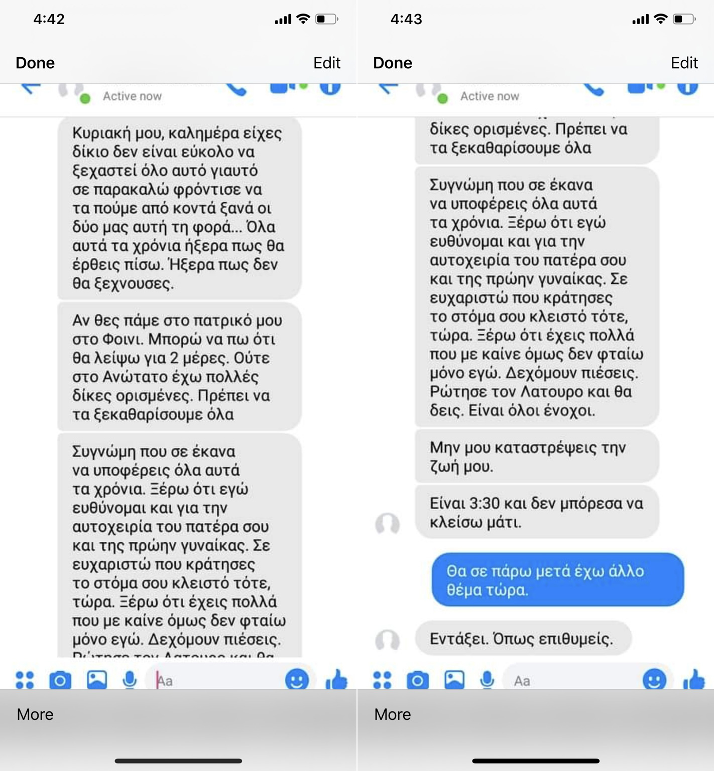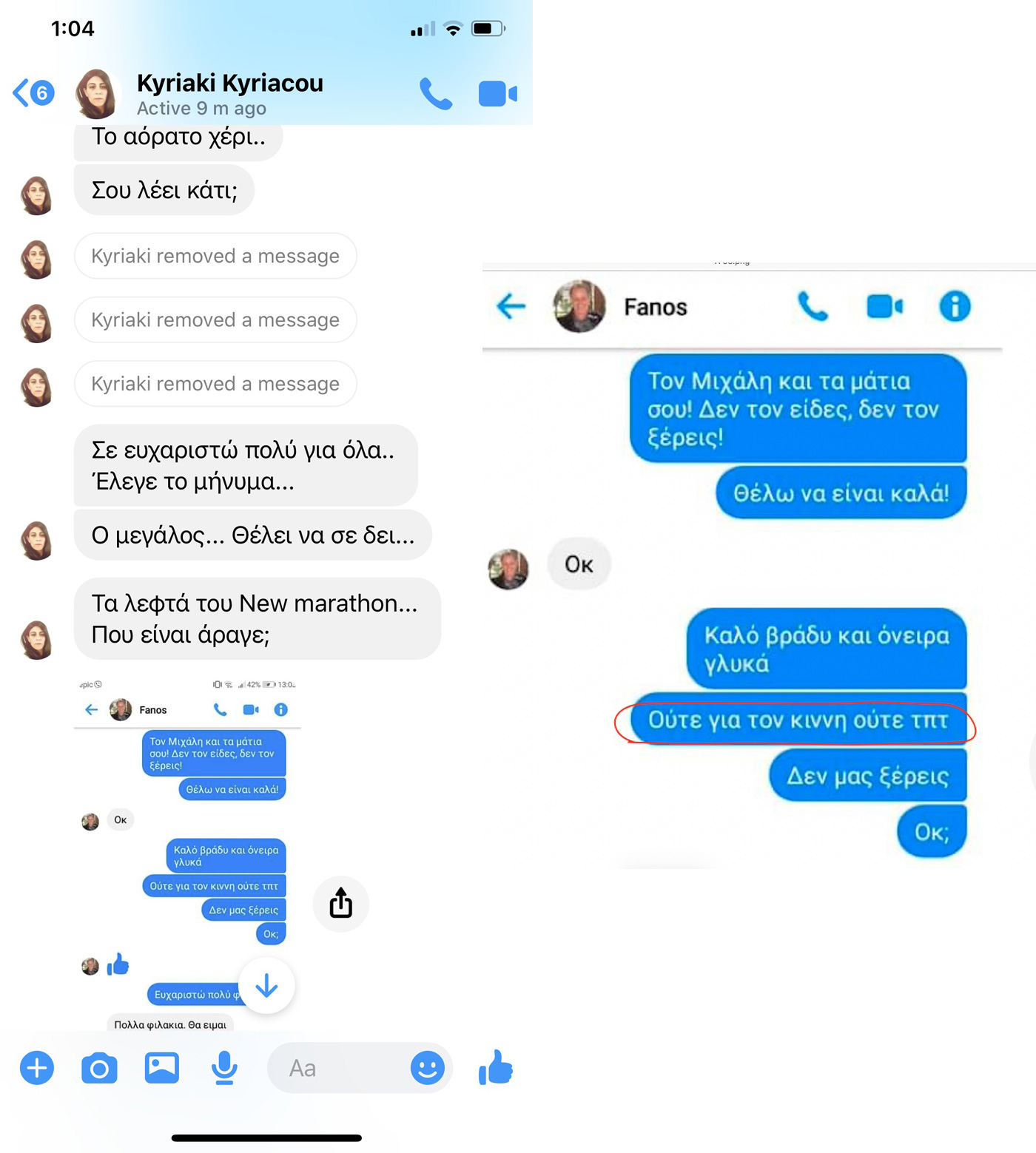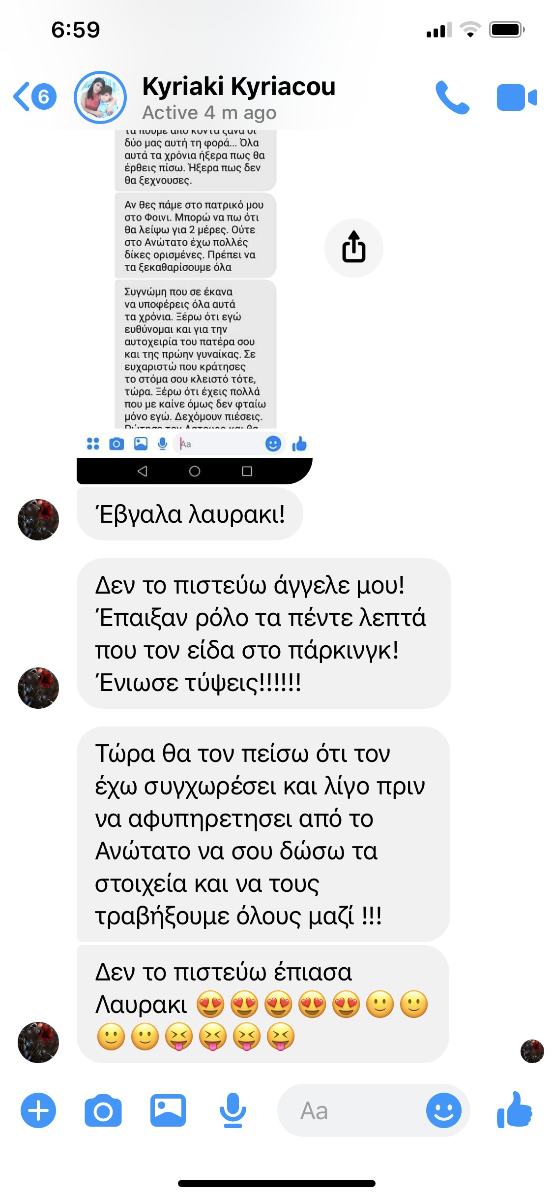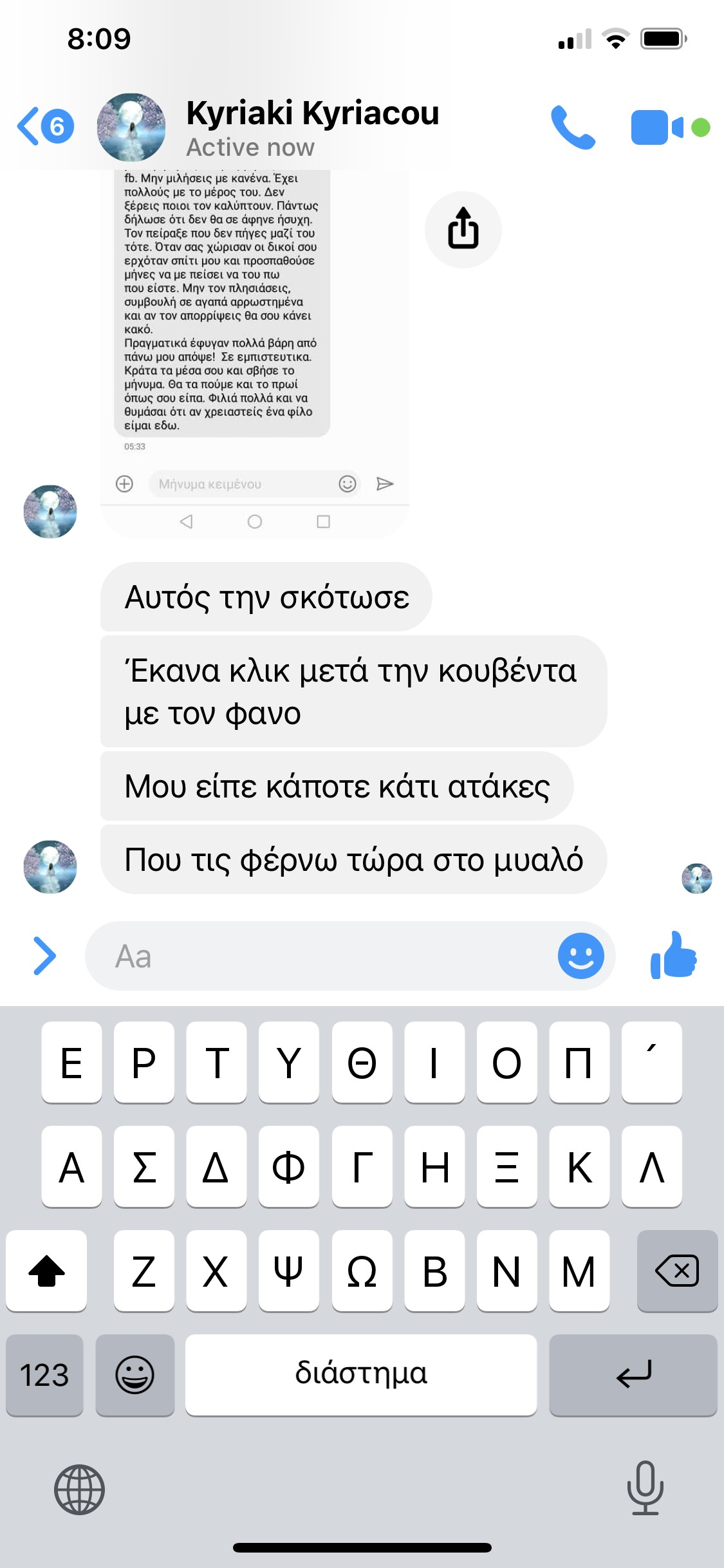 «Ξέρεις μίλησα με κάποιο άτομο και μου είπε κάποια πράγματα. Μου είπε ότι κινδυνεύω από εσένα. Δεν με ενδιαφέρει. Είμαι έτοιμος για όλα. Για κάθε πόλεμο, ακόμα και για το θάνατο. Μου είπαν ότι θα μπεις μπροστά και θα κινδυνέψω. Όμως θα έρθω, το να είμαι εδώ δεν ωφελεί. Μου είπαν ότι δεν θα είσαι μόνη σου και εγώ ξέρω πολύ περισσότερα και δεν θα είναι ο [REDACTED]. Έχω την κατάρα να αντιλαμβάνομαι τα πάντα. Εσύ κοιμάσαι. Ο λόγος που σου τα άφησα όλα είναι γιατί ξέρω μέσα μου πως ο κίνδυνος στον οποίο αναφέρεται είναι το τέλος μου και θέλω να είστε εξασφαλισμένοι. Το αύριο σας σκέφτομαι». (Είναι στο προηγούμενο αρχείο η πηγή)