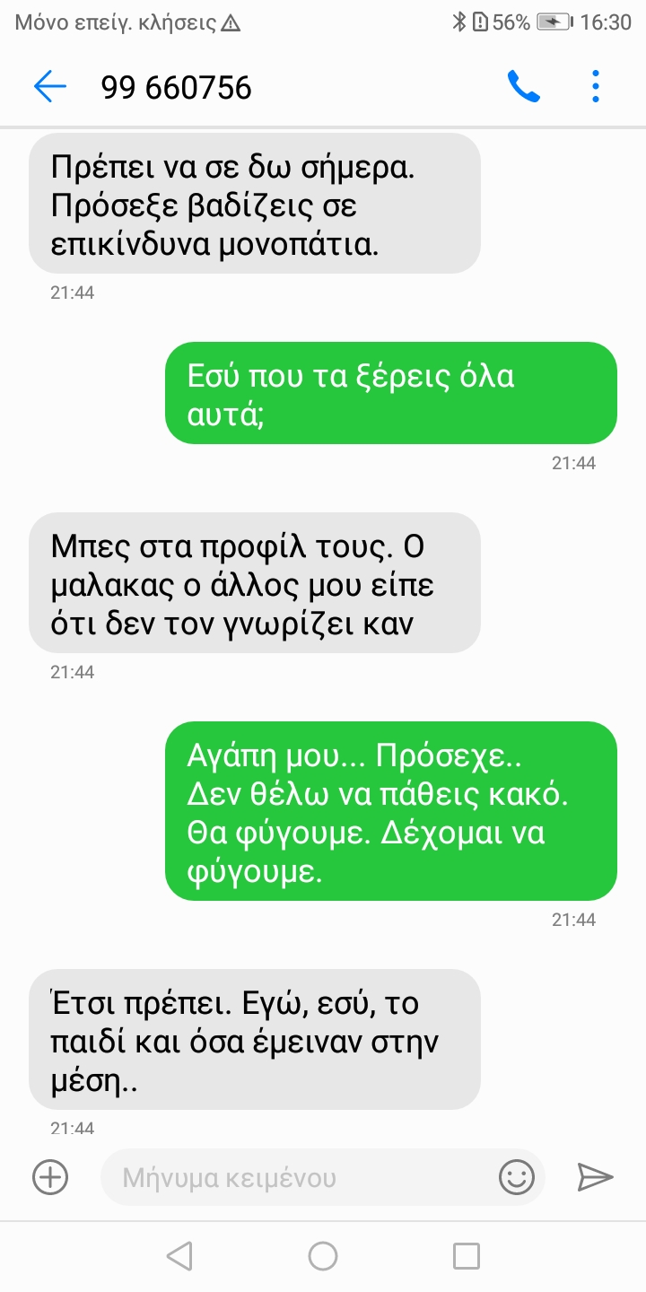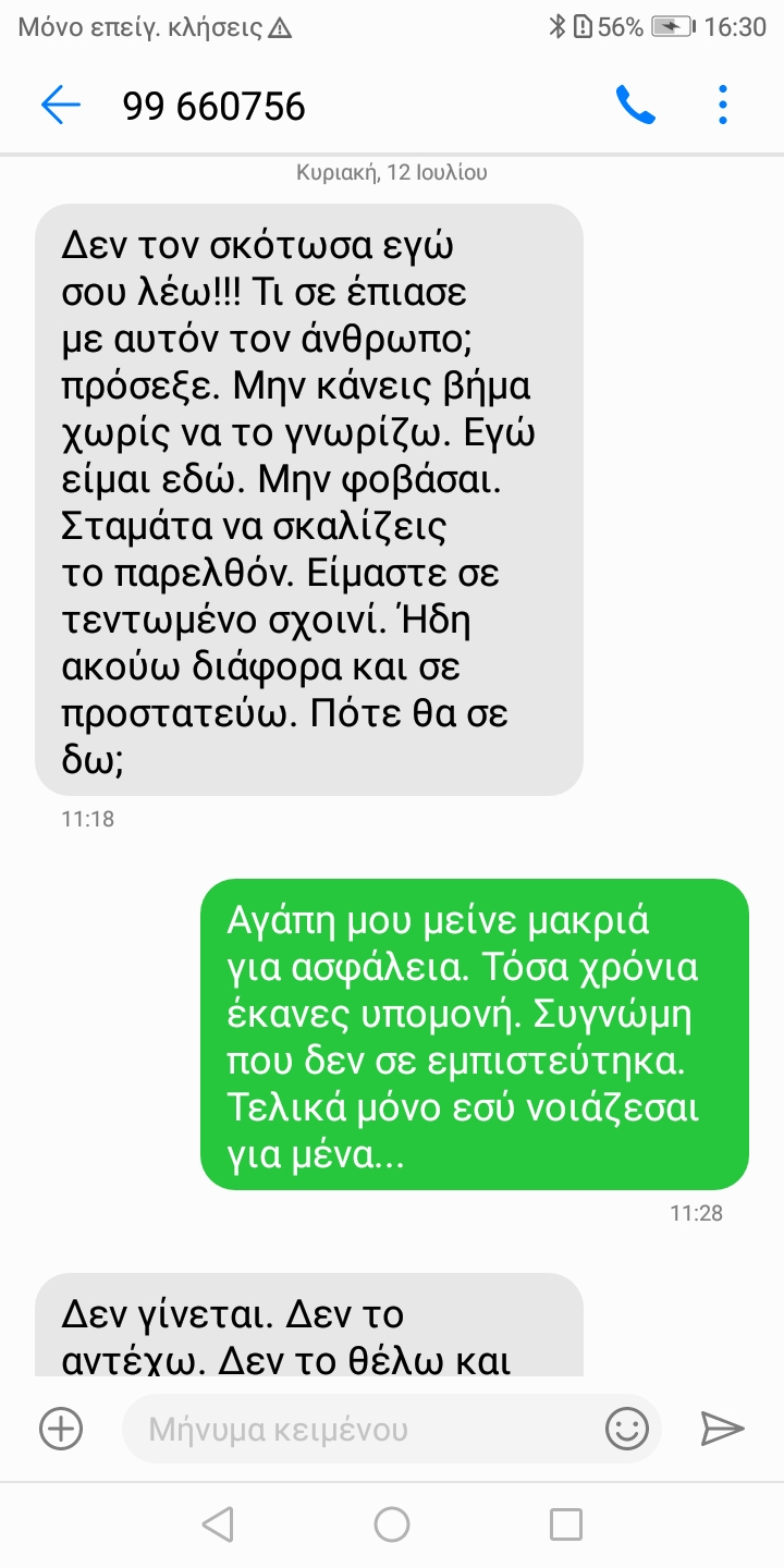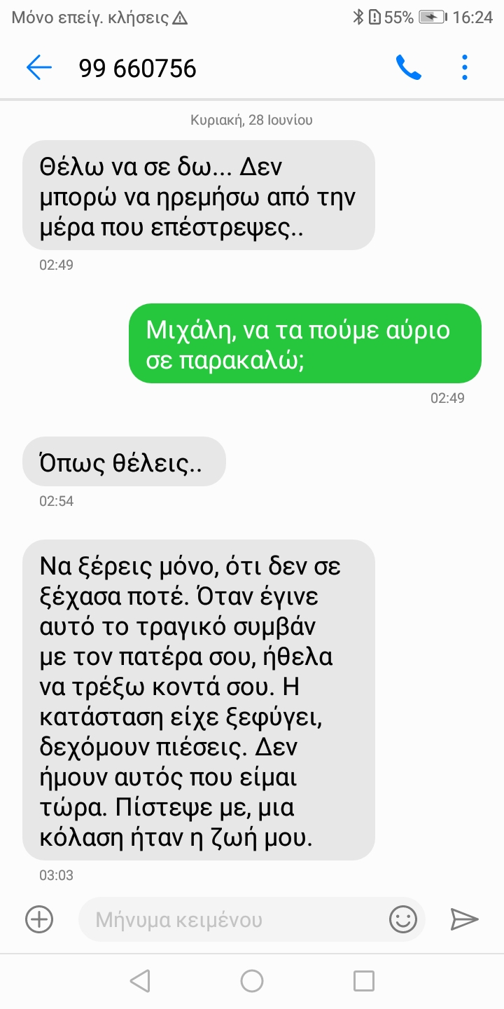 ΜΧ: Απάντησε το τηλέφωνο σου, έρχομαι. Σε παρακαλώ πες μου που είσαι. Δεν αντέχω άλλο.