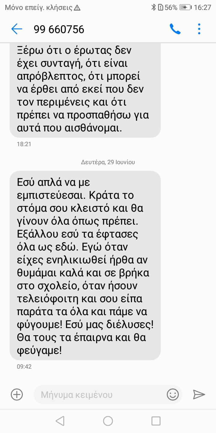 ΜΧ: Σε παρακαλώ πες μου που είσαι, δεν αντέχω άλλο. Θέλω να σε δω. Θέλω να φύγω από το σπίτι. Δεν αντέχω να ζω μαζί τους. Αν με αγάπησες έστω και λίγο κάποτε έλα να φύγουμε μαζί. Άστα όλα πίσω και φύγαμε. Δεν αντέχω να σε χάσω δεύτερη φορά. Δεν αντέχει η καρδιά μου τέτοιο πόνο.[23]
