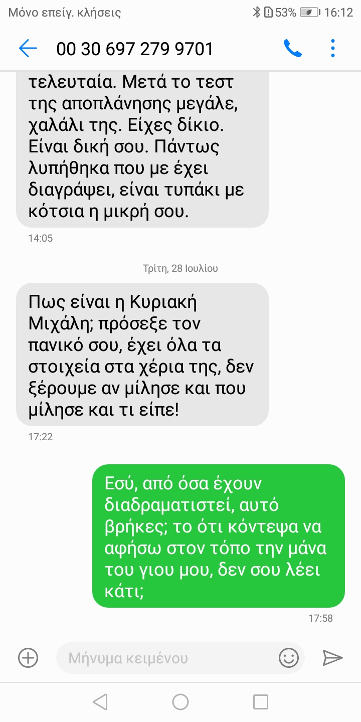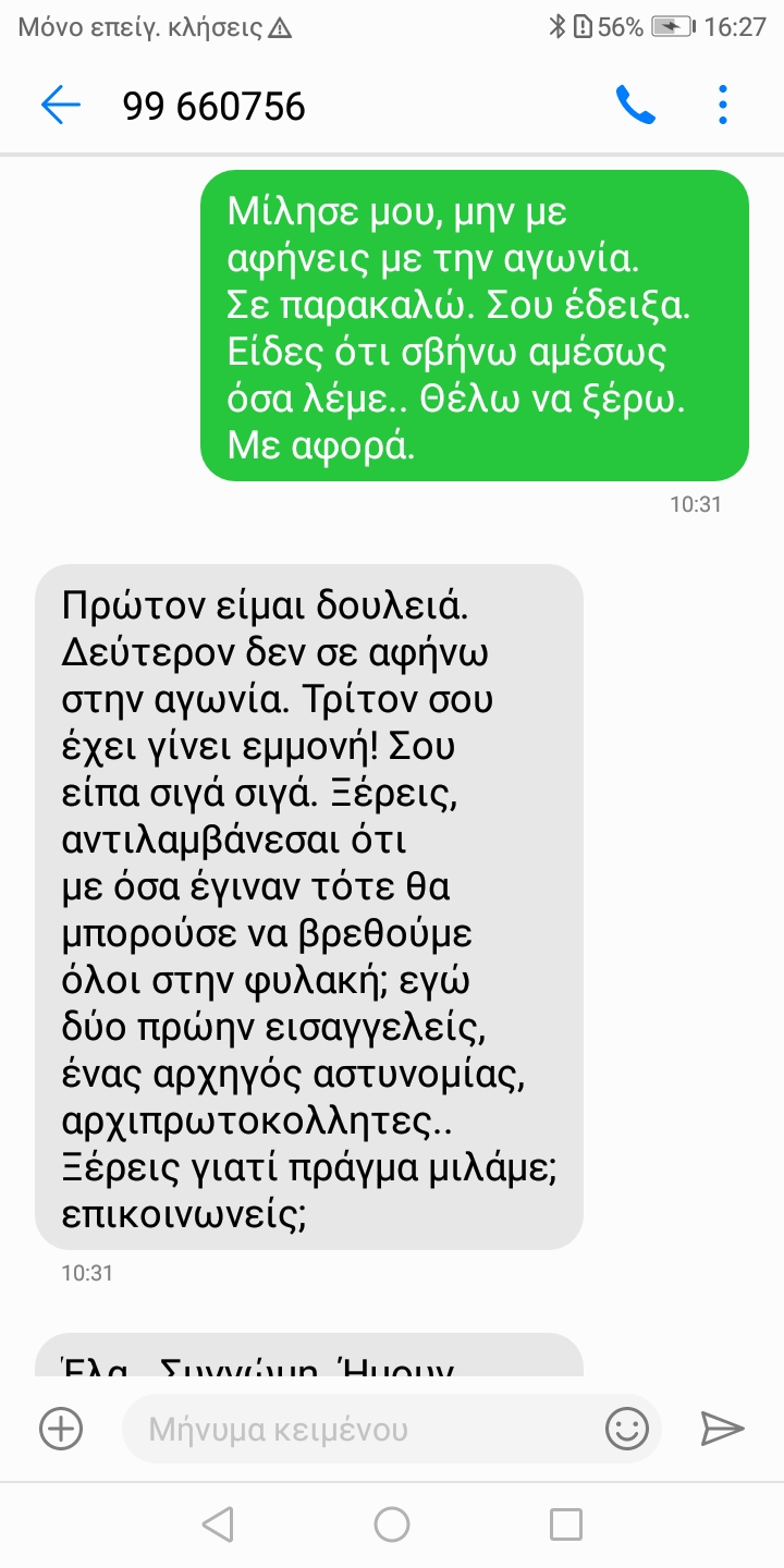 Σ: «Μίλησε μου, μην με αφήνεις με την αγωνία. Σε παρακαλώ. Είδες σβήνω όσα λέμε. Θέλω να ξέρω με αφορά.»