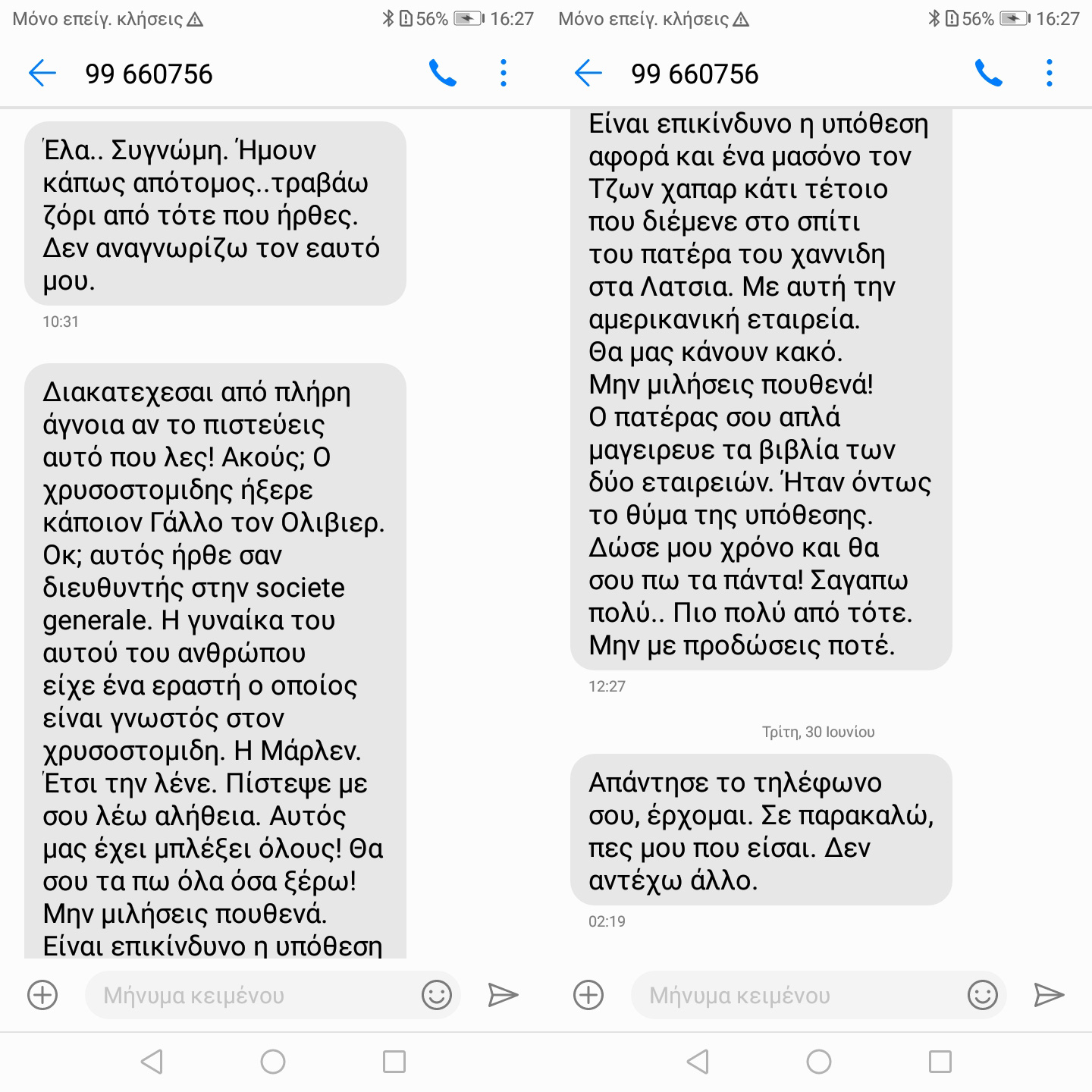 ΜΧ: «Ο Χρυσοστομίδης ήξερε κάποιον Γάλλο τον Όλιβερ. Οκ; Αυτός ήρθε σαν διευθυντής στην société generale. Η γυναίκα του αυτού του ανθρώπου είχε ένα εραστή ο οποίος είναι γνωστός στον Χρυσοστομίδη. Η Μάρλεν. Έτσι την λένε. Πίστεψε με σου λέω την αλήθεια. Αυτός μας έχει μπλέξει όλους! Θα σου τα πω όλα όσα ξέρω! Μην μιλήσεις πουθενά. Είναι επικίνδυνο, η υπόθεση αφορά και ένα μασόνο τον Τζων Χαπάρ, κάτι τέτοιο, που διέμενε στο σπίτι του πατέρα του Χαννίδη στα Λατσιά. Με αυτή την αμερικανική εταιρεία. Θα μας κάνουν κακό. Μην μιλήσεις πουθενά! Ο πατέρας σου απλά μαγείρευε τα βιβλία των δύο εταιρειών. Ήταν όντως θύμα της υπόθεσης. Δώσε μου χρόνο και θα σου πω τα πάντα! Σ’ αγαπώ πολύ. Πιο πολύ από τότε. Μην με προδώσεις ποτέ.»[21]