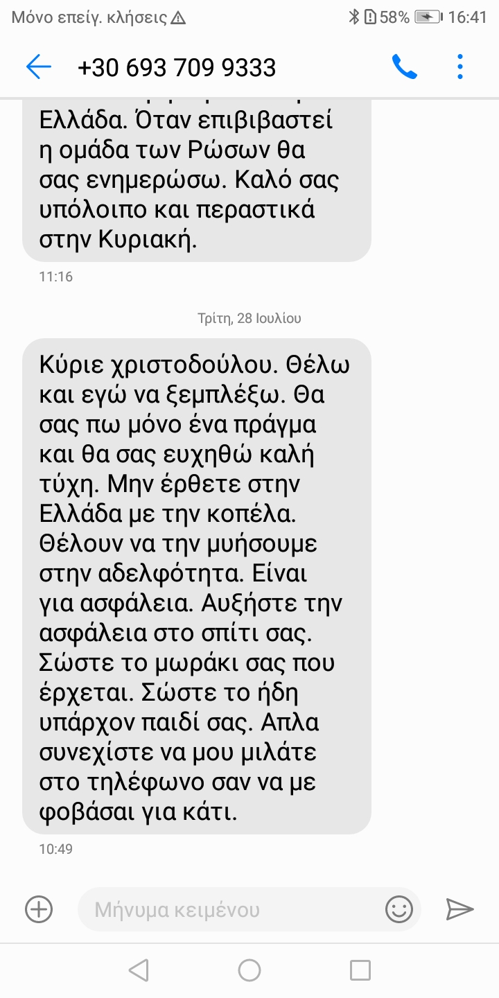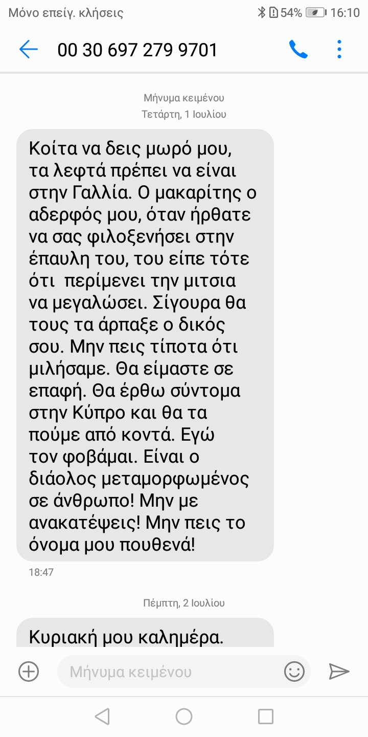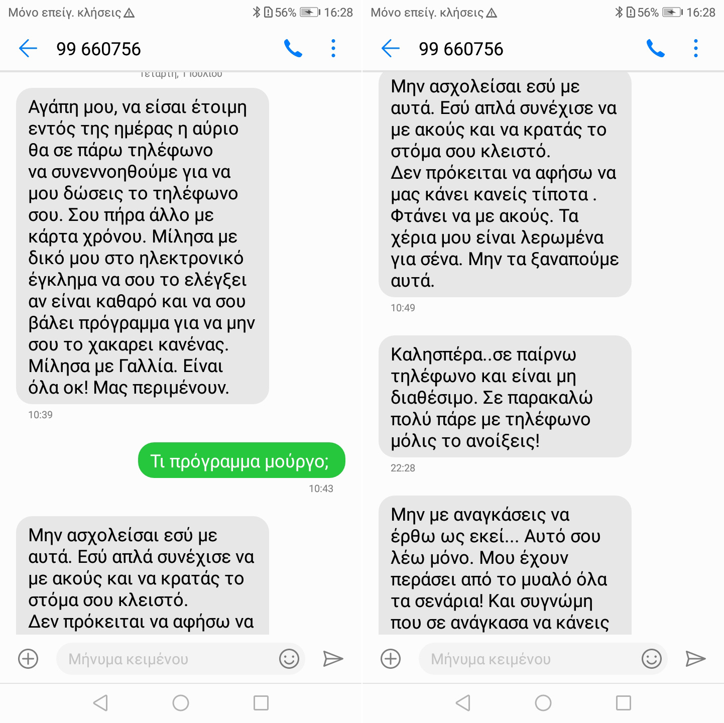 ΜΧ: «Αγάπη μου να είσαι έτοιμη εντός της ημέρας ή αύριο να σε πάρω τηλέφωνο να συνεννοηθούμε για να μου δώσεις το τηλέφωνο σου. Σου πήρα άλλο με κάρτα χρόνου. Μίλησα με δικό μου στο ηλεκτρονικό έγκλημα να σου το ελέγξει αν είναι καθαρό και να σου βάλει πρόγραμμα για να μη σου το χακάρει κανένας. Μίλησα με Γαλλία. Είναι όλα οκ! Μας περιμένουν.»