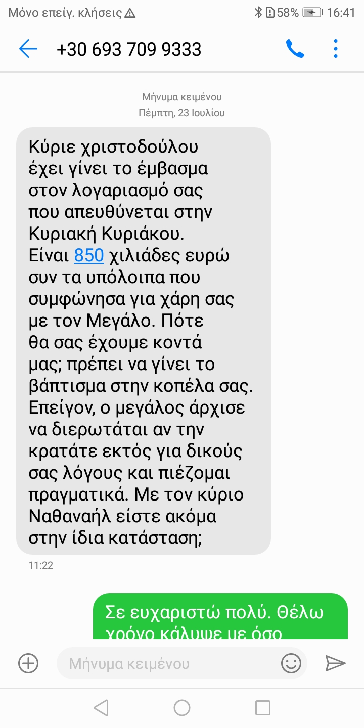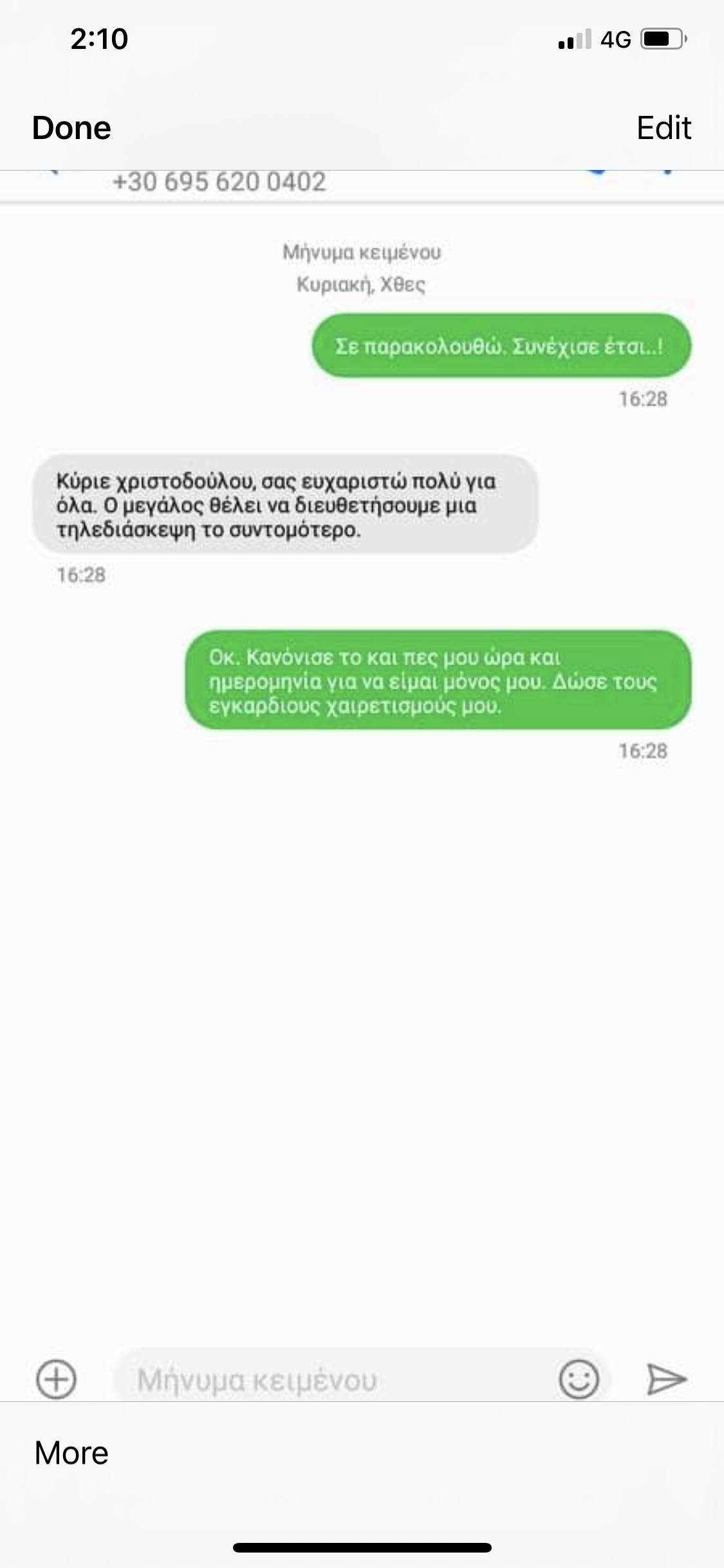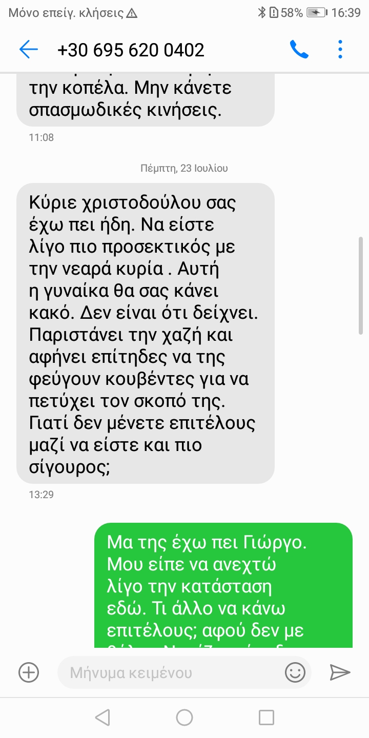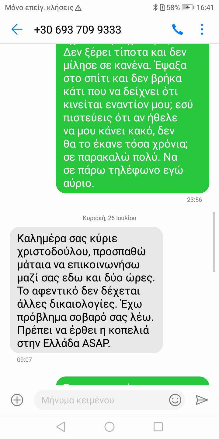 ΜΧ: «Αγάπη μου να είσαι έτοιμη εντός της ημέρας ή αύριο να σε πάρω τηλέφωνο να συνεννοηθούμε για να μου δώσεις το τηλέφωνο σου. Σου πήρα άλλο με κάρτα χρόνου. Μίλησα με δικό μου στο ηλεκτρονικό έγκλημα να σου το ελέγξει αν είναι καθαρό και να σου βάλει πρόγραμμα για να μη σου το χακάρει κανένας. Μίλησα με Γαλλία. Είναι όλα οκ! Μας περιμένουν.»