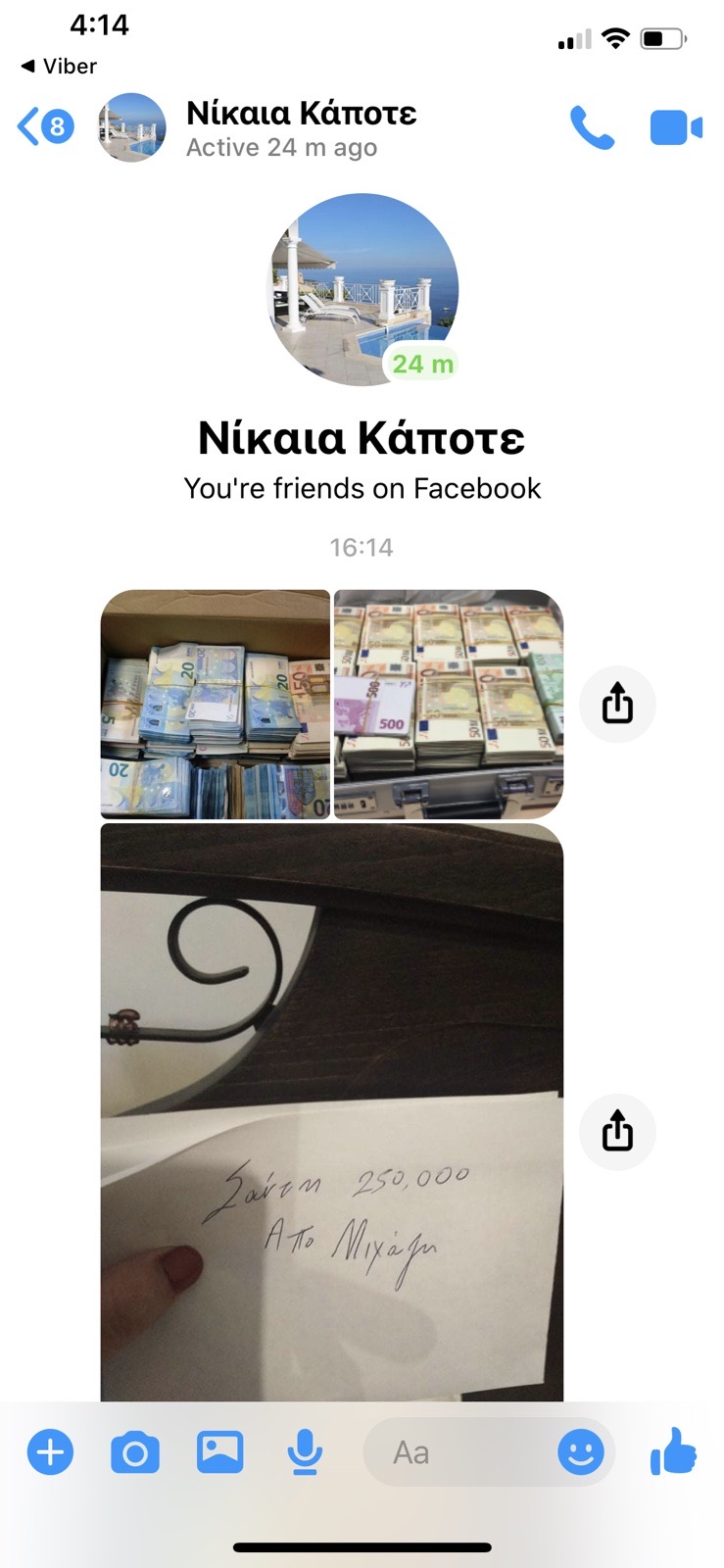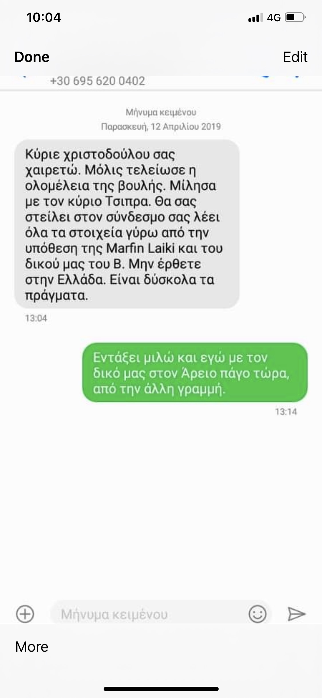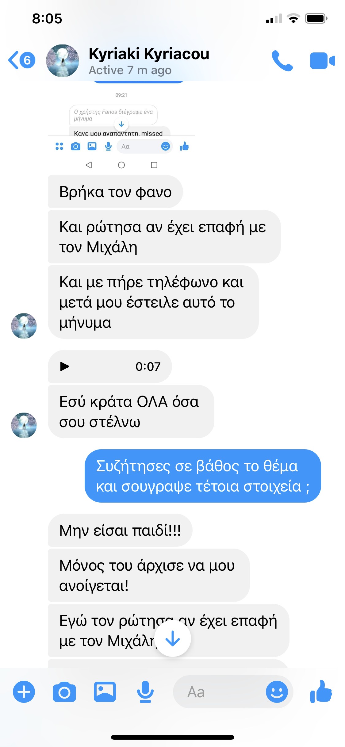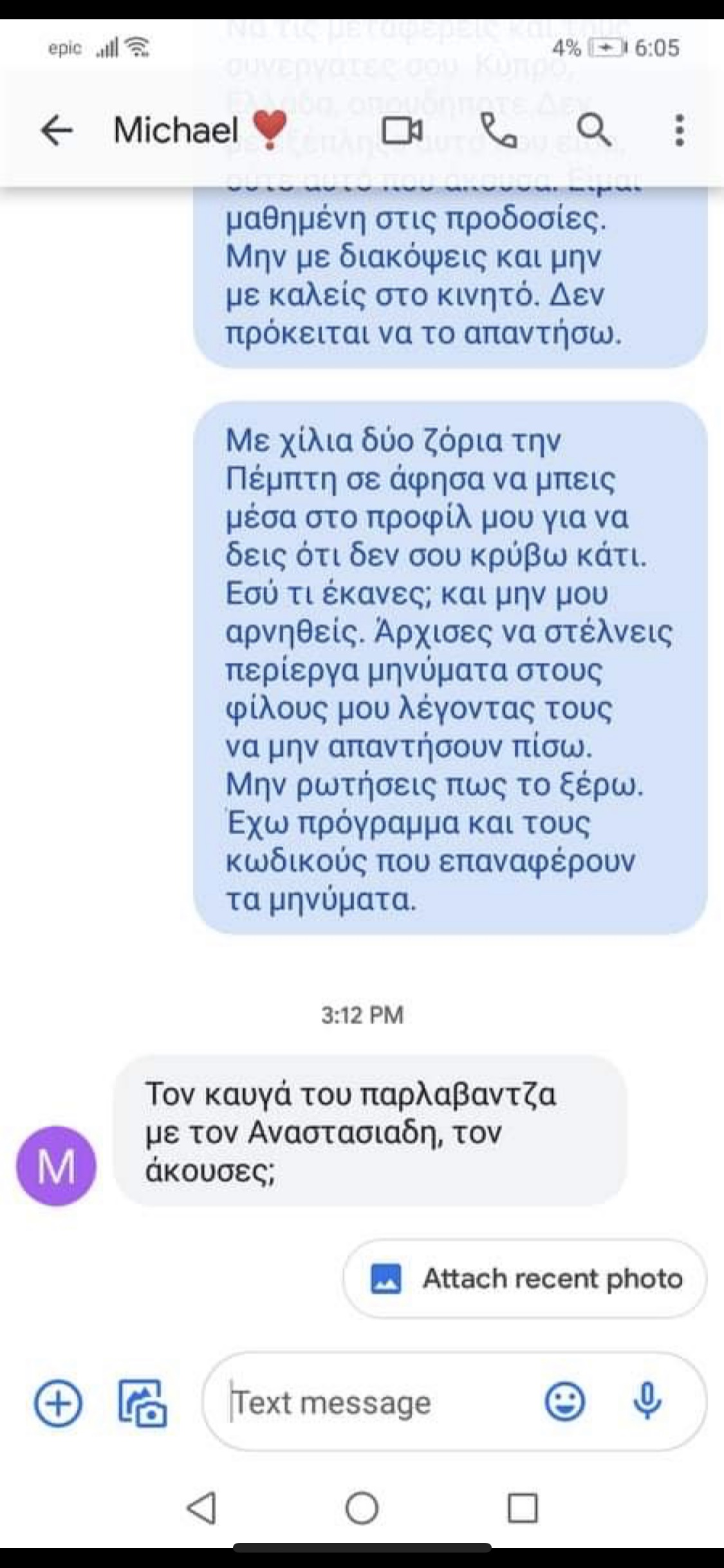 «Στην Κύπρο έμαθαν ότι έφυγα και γίνεται ένας πόλεμος κρυφός. Μου το έστειλε ο Μιχάλης με μήνυμα ότι εννά τον φαν. Έμαθαν ότι έφυγα, ξέρουν ότι τα λεφτά εν πάνω μου και πιέζουν τον να τους πουν που είμαι». (Ηχογραφημένη συνομιλία, 16.3.2021)