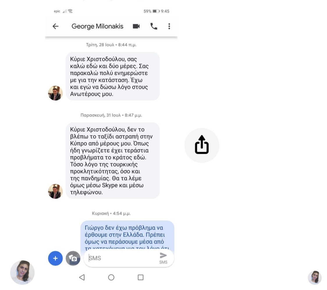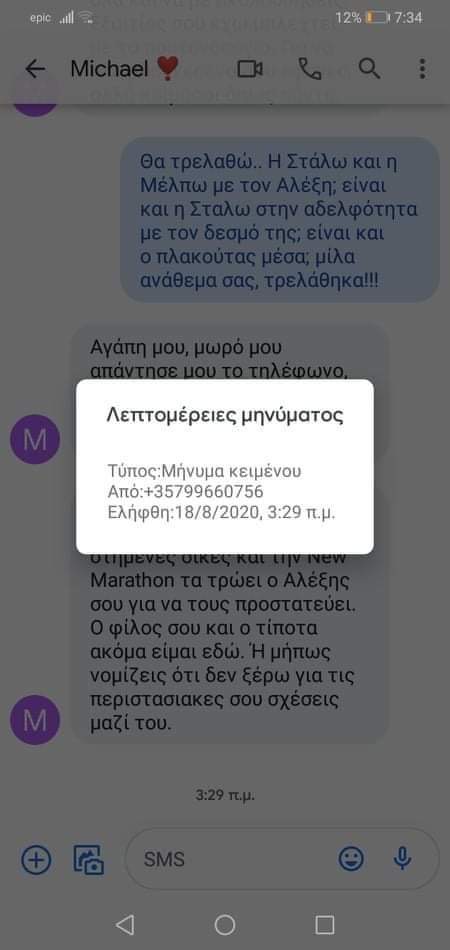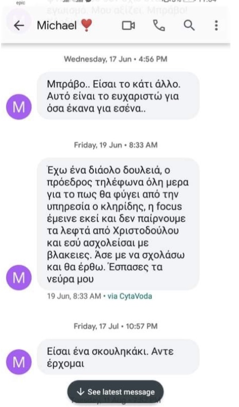 Στις 19 Αυγούστου 2020, στις 2:17 έφτασε στο κινητό του Μιχάλη Χριστοδούλου ένα μήνυμα από τον Μύρωνα Νικολάτο, που αναφέρει τα εξής: