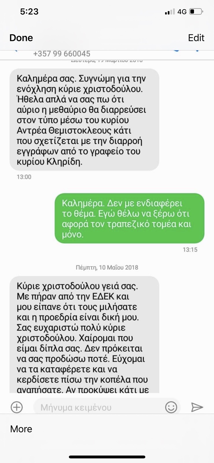 Λίγες μέρες αργότερα και συγκεκριμένα στις 8 Μαΐου 2023, ενώ είχα άρχισα να ερευνώ τους ισχυρισμούς της, πήρα μήνυμα (Signal) από τον Νίκο Κληρίδη με το εξής περιεχόμενο: «Μην ασχοληθείς με το θέμα και μην εμπιστευτείς ΚΑΝΕΝΑ ΑΠΟΛΥΤΩΣ. Είσαι σε κίνδυνο».[3] Το μήνυμα αυτό το εξέλαβα ως σοβαρή απειλή για την ζωή μου.