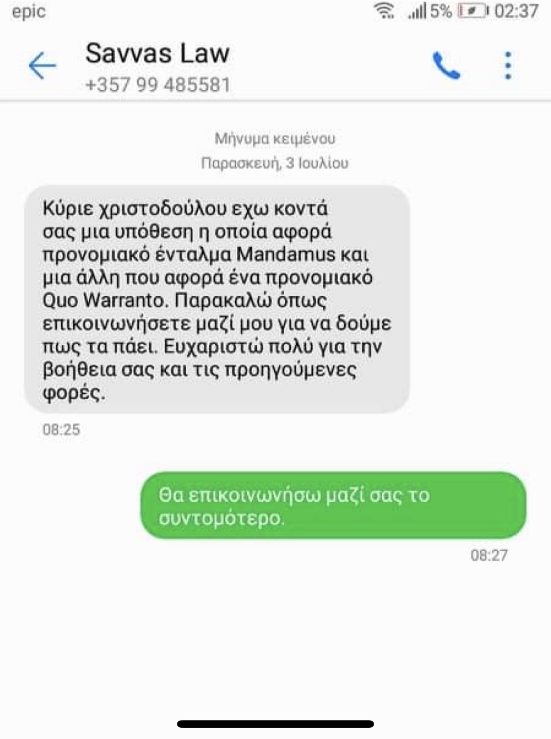 «Είπε του η μάμμα μου “ήντα πoυ τη θέλεις”. Είπε της “θέλει κάτι να τη ρωτήσει ο κύριος [REDACTED] για ένα θέμα”. Λέει του η μάμμα μου, “τι τη θέλει τούτος ο [REDACTED] την κόρη μου εν τζεν δικηγόρος”. “Εν θέμα αυστηρά προσωπικό. Που μπορώ να την βρω για να λύσουμε μια εξωδικαστική αυτή;” Έπιασεν με η αδελφή μου τζαι λέει μου, “μα που επήες τζαι έμπλεξες με δικηγόρους τζαι δικαστές;”» (Ηχογραφημένη συνομιλία (2.00) 17/3/2021)